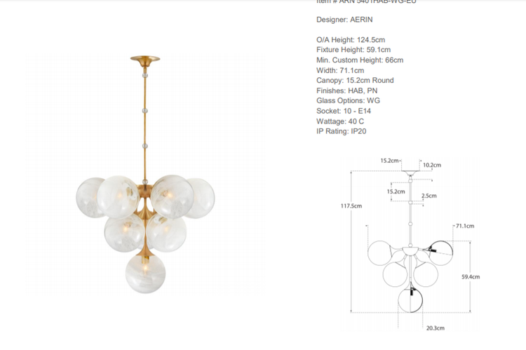 - Cristol chandelier by Aerin design is made of brass and finished with white glass. The chandelier has a socket for an E 14 bulb.