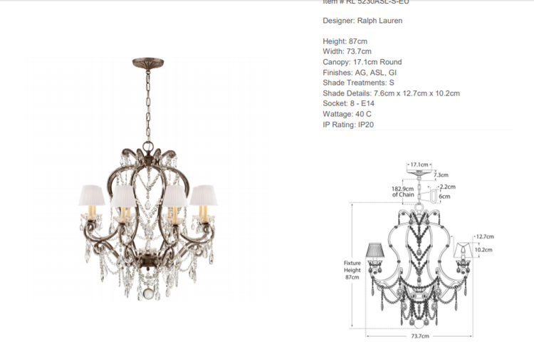 • The Adrianna Small chandelier by Ralph Lauren Home was made of silver. The chandelier has sockets for E 14 bulbs.