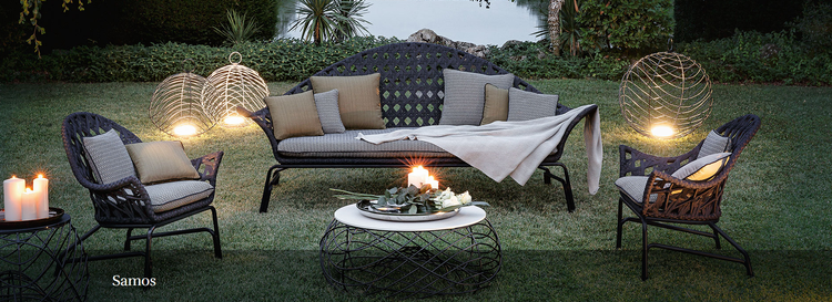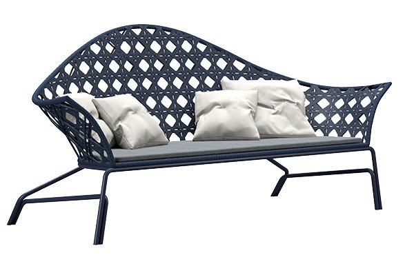 The Samos garden sofa by Smania is made of powder-coated aluminum, and finished with a polyester cover and removable seat cushion. Product available in various fabric finishes. The price quoted is the price for a piece of furniture in category A fabric. Dimensions: 220 x 90 x 106 cm.