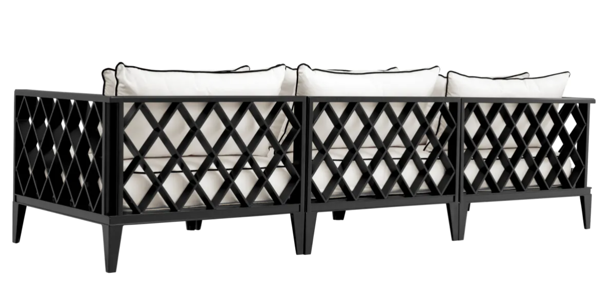 The Ocean Club garden sofa by Eichholtz is made of aluminum in black and finished with removable sunbrella canvas fabric cushions. The fabric used in our outdoor collection is the most popular Sunbrella® outdoor fabric. Woven from 100% dyed acrylic, Sunbrella® is easy to care for, stain resistant, colorfast and provides up to 98% UV protection.