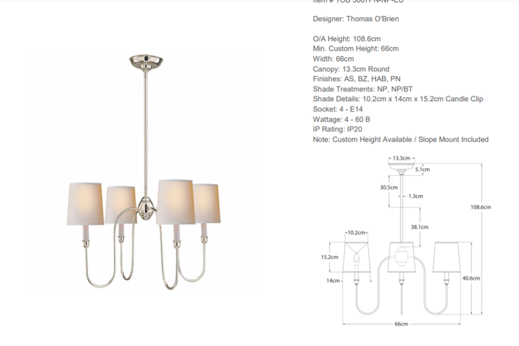 - The Vendome Small chandelier by Thomas O'Brien is crafted from polished nickel with linen shades. It has an E14 bulb socket.
