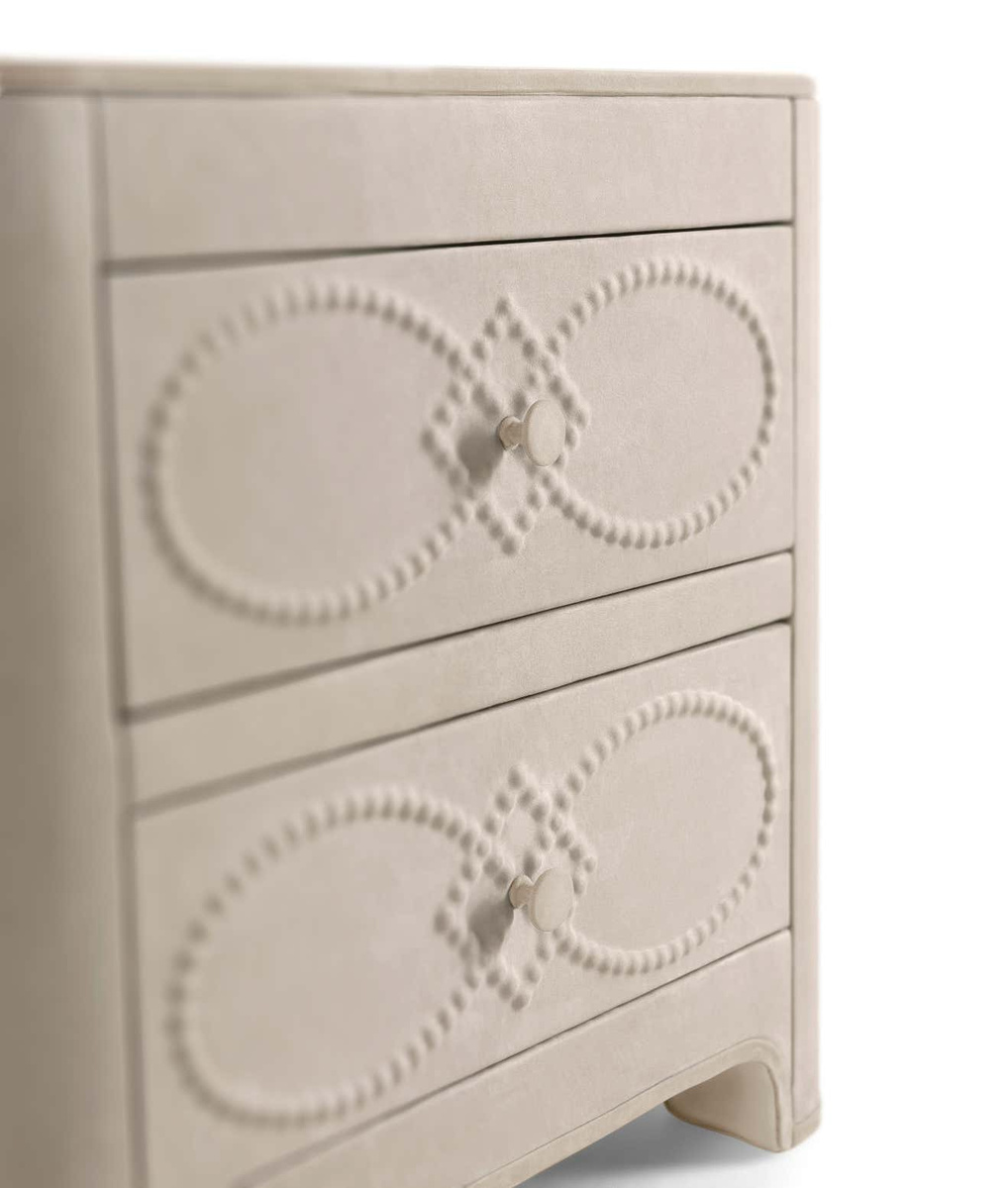 - The Infinity nightstand by Gianfranco Ferré Home is crafted from poplar with a light-colored fabric finish. It features two drawers with upholstered handles and a top with clear protective glass.