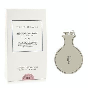 True Grace Moroccan Rose closet fragrance sachets, from the Village collection. Top notes: green citrus. Heart notes: garden rose. Base notes: violet, sandalwood. The package contains five pieces. The fragrance lasts up to 4 wks.