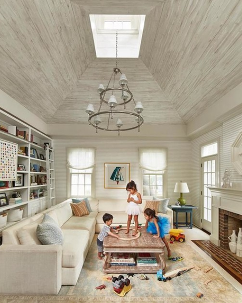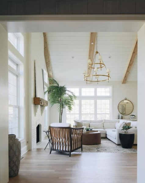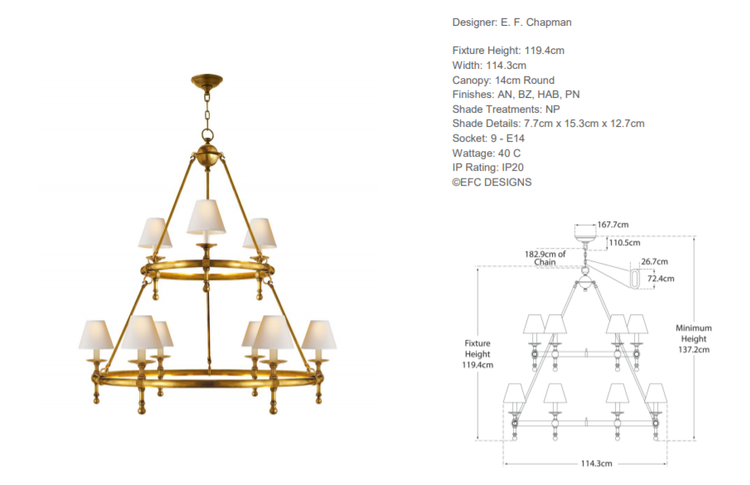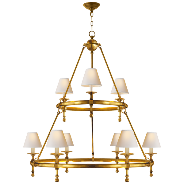 - Classic Ring chandelier by Project Chapman & Myers was made of antique brass and finished with linen lampshades. The chandelier has a socket for an E 14 bulb.