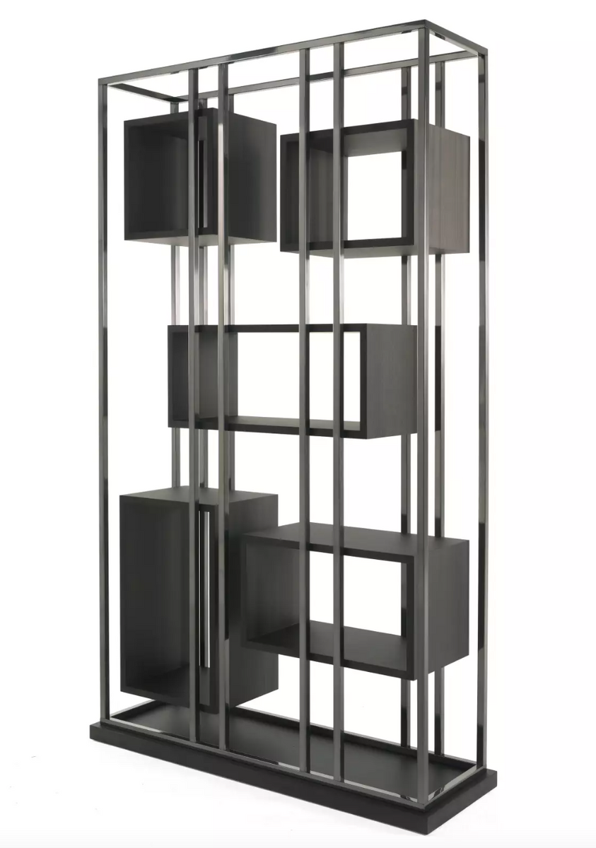 The Mackintosh Shelf by Gianfranco Ferré Home features a 25 x 25 mm tubular metal structure with a brushed brass or black chrome finish. The base is made of multi-layered wood with a Smokey Grey Tay veneer finish. The squares are made of multi-layered wood with a Smokey Grey Tay veneer finish, in various sizes and spacing. Dimensions: 135 x 45 x 235 cm