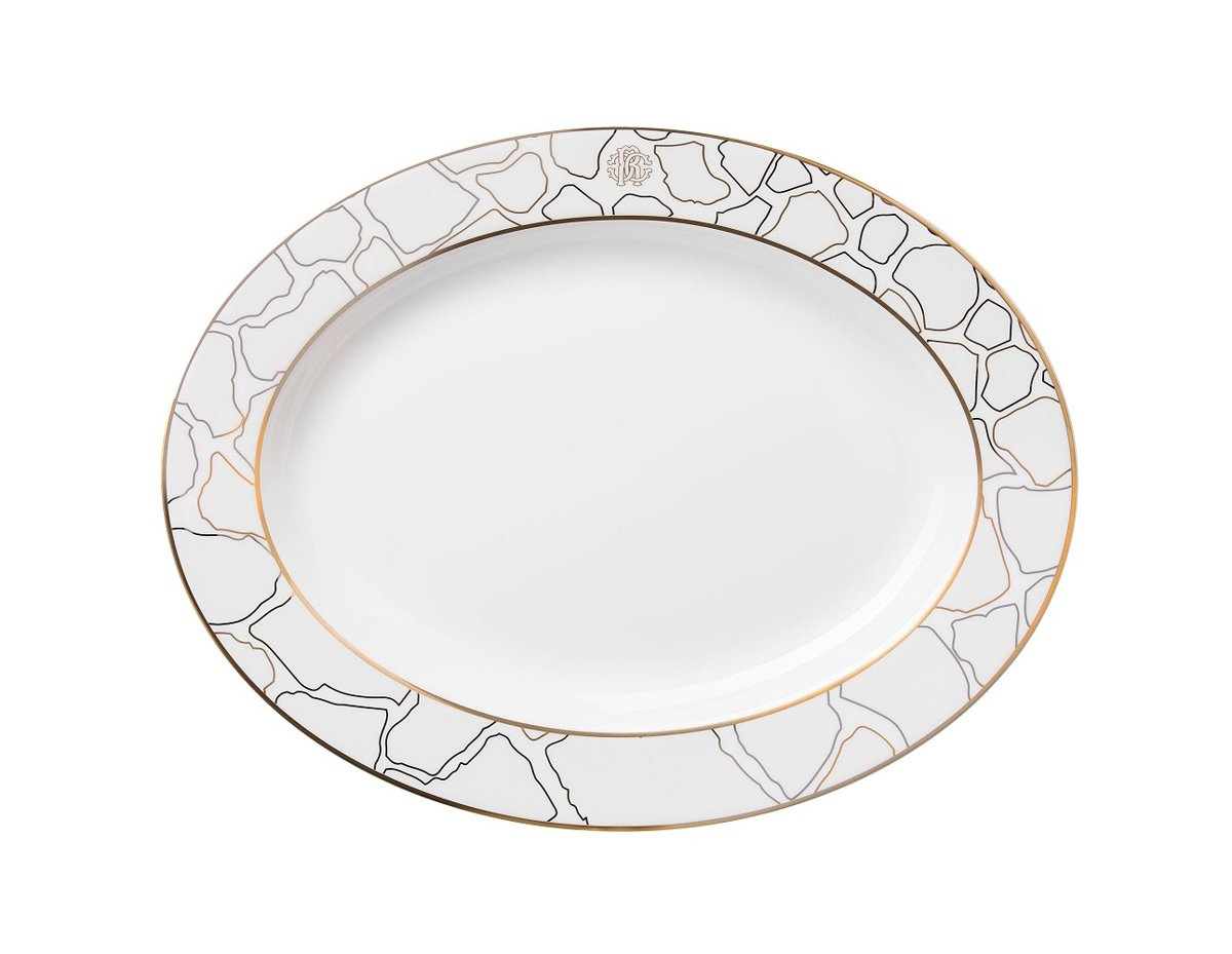 • The platter by Roberto Cavalli Home, from the Giraffa collection, is made of high quality bone china. It is distinguished by an outer shell, covered with gold and platinum, resembling giraffe skin and the Roberto Cavalli monogram.