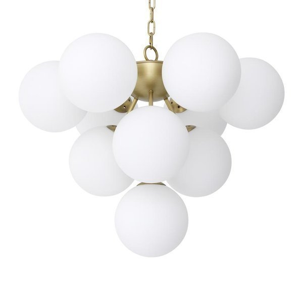 - The Icaro chandelier by Eichholtz is made of brass and finished with white glass shades.