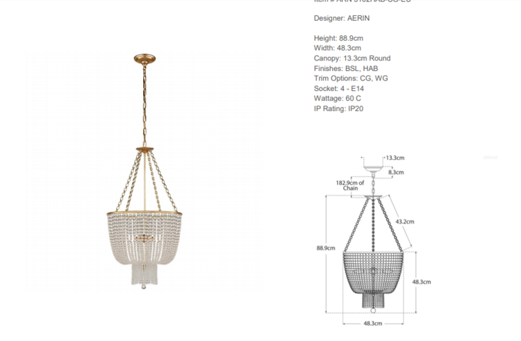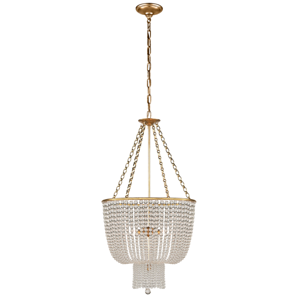 - The Jacqueline chandelier by Aerin is made of hand-rubbed antique brass and finished with transparent glass.