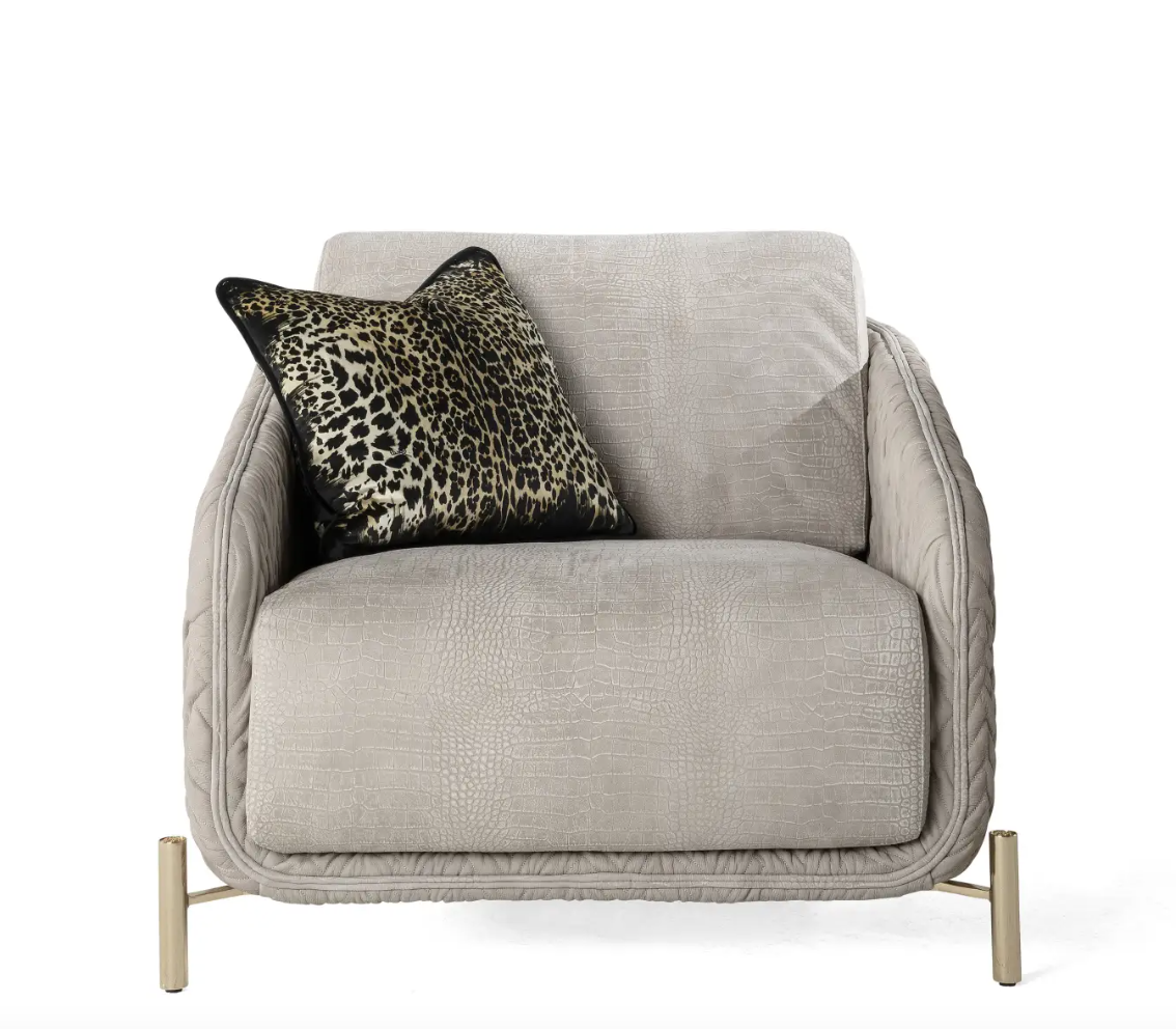 - The Clifton armchair by Roberto Cavalli Home Interiors features poplar wood and foam construction. Upholstered with nubuck in an orange shade and finished with an animal motif backside. Legs made of shiny metal in gold color.