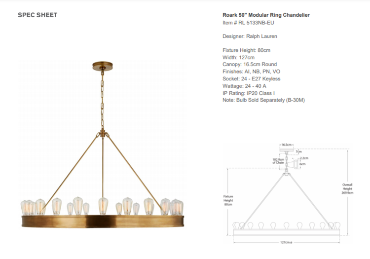 - The Roark 50 chandelier designed by Ralph Lauren Home is made of polished brass. The chandelier has a socket for an E 27 bulb.