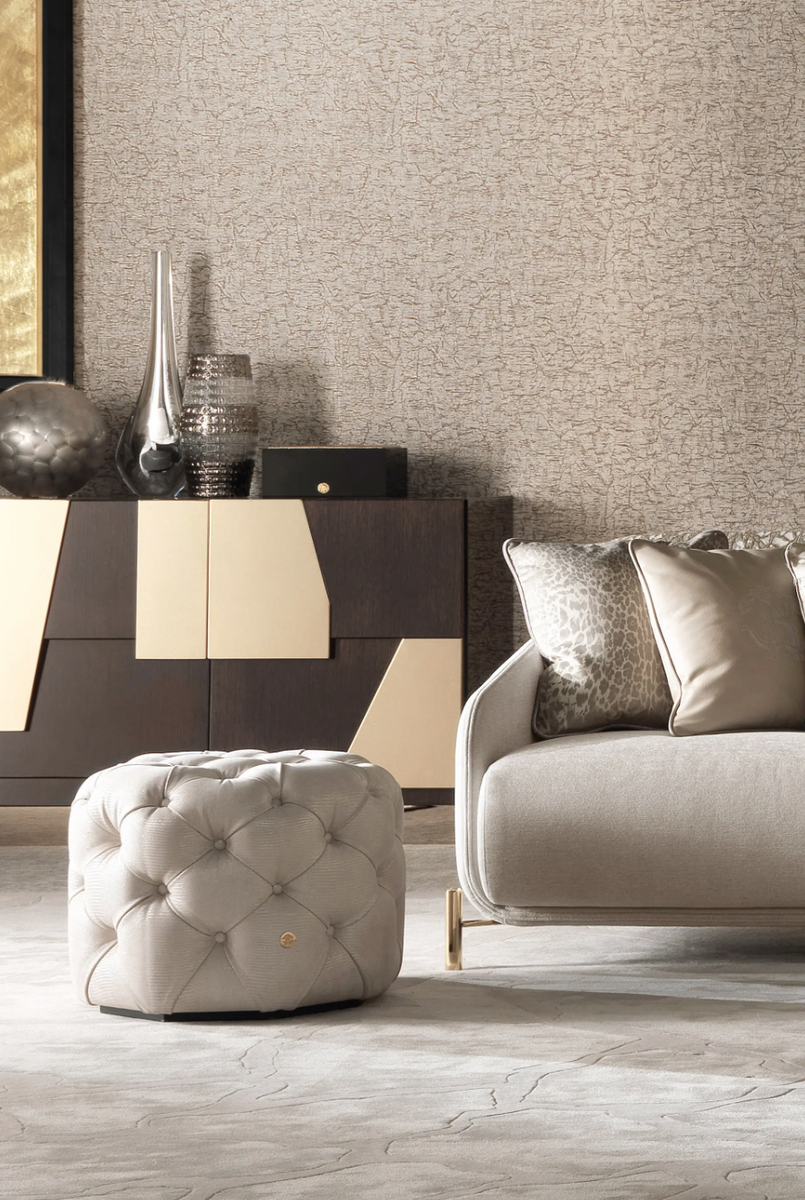 - The Limbo pouffe by Roberto Cavalli Home Interiors is made of poplar wood and foam. Capitonné upholstery in CAT fabric. C George colour 29 ivory and finished with buttons in the same colour.