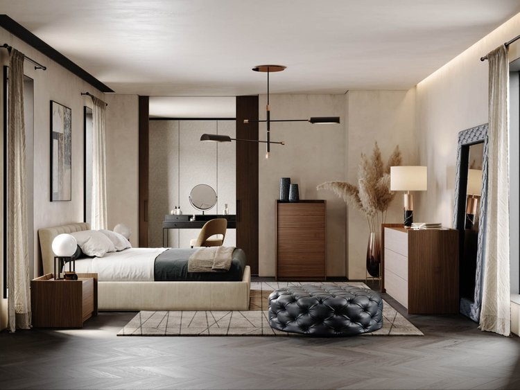 - Norma bed by Laskasas is made of Vienna Paris Beige fabric. The bed is available in three sizes.