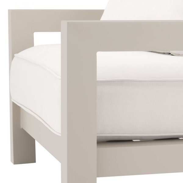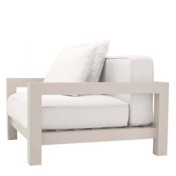 The Cap-Antibes garden armchair by Eichholtz is made with a sand-colored aluminum frame and finished with sunbrella canvas fabric. The fabric used in our outdoor collection is the most popular Sunbrella® outdoor fabric. Woven from 100% dyed acrylic, Sunbrella® is easy to care for, stain resistant, colorfast and provides up to 98% UV protection.