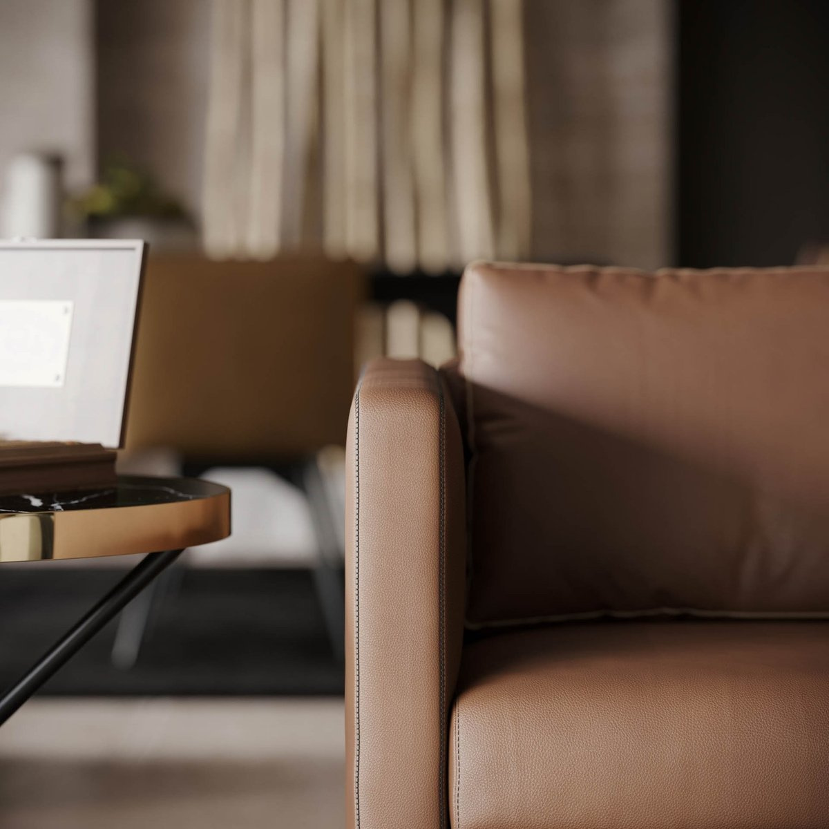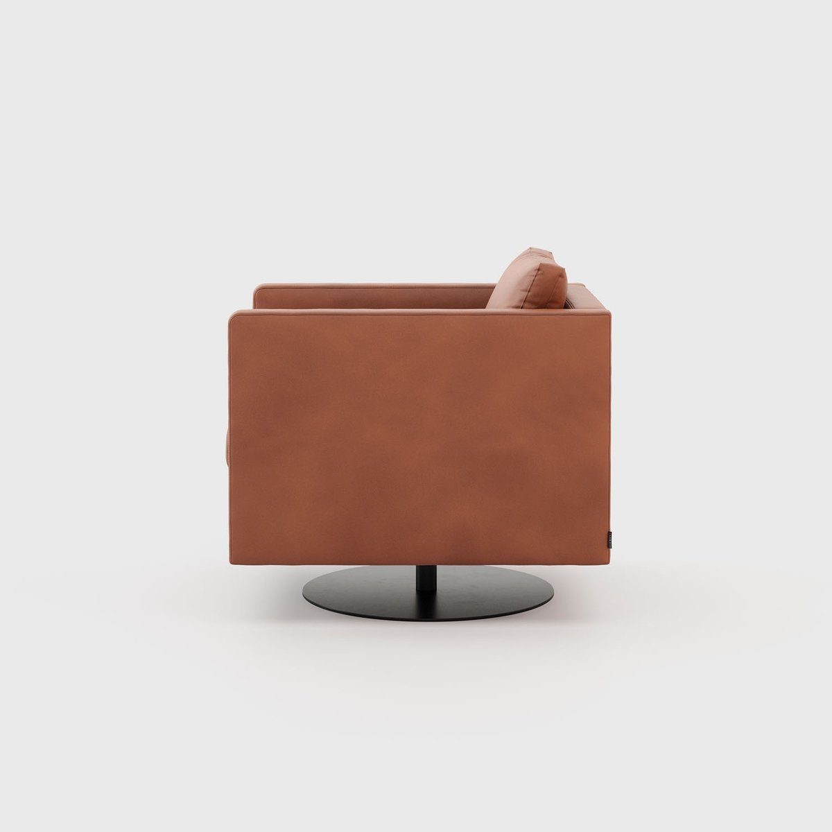 The Marlow armchair by Laskasas is made of Viennese fabric and finished with a black iron base. Product also available on request in leather. Dimensions: 80 x 82 x 82 cm.