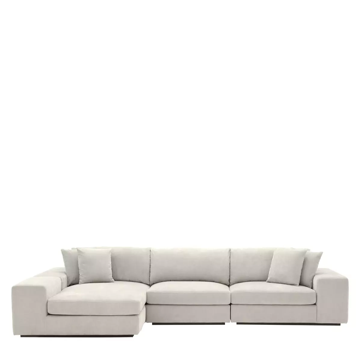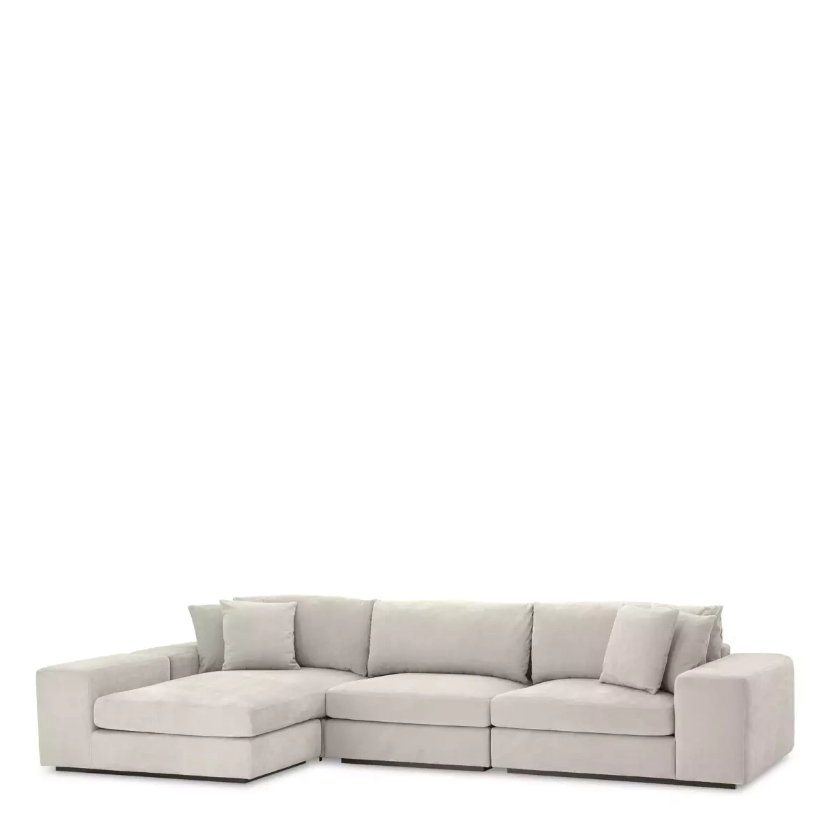 - The Vista Grande sofa by Eichholtz is upholstered in clarck sand and finished with a black base.