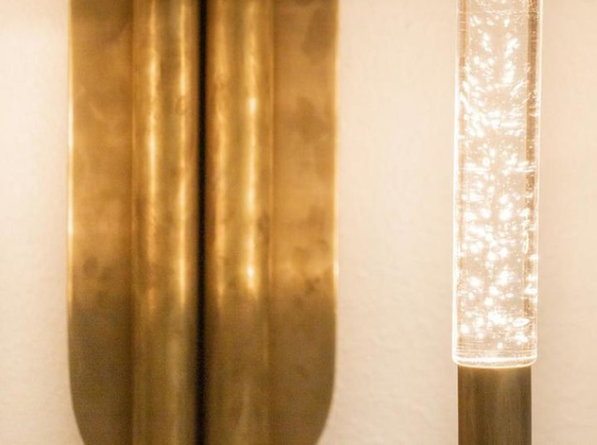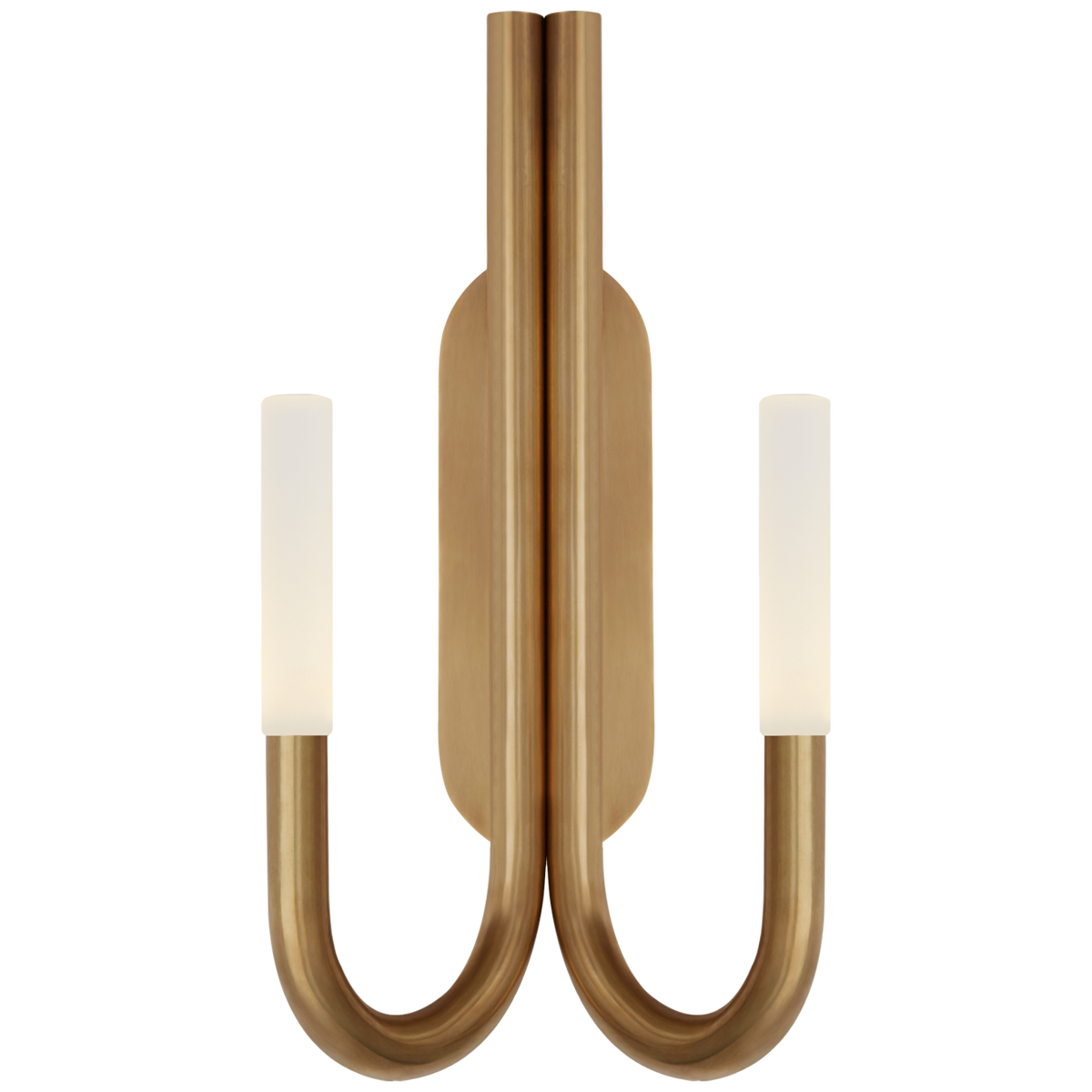 The Rousseau Double wall lamp designed by Kelly Wearstler is made of polished brass and finished with crystal. The lamp has an LED.