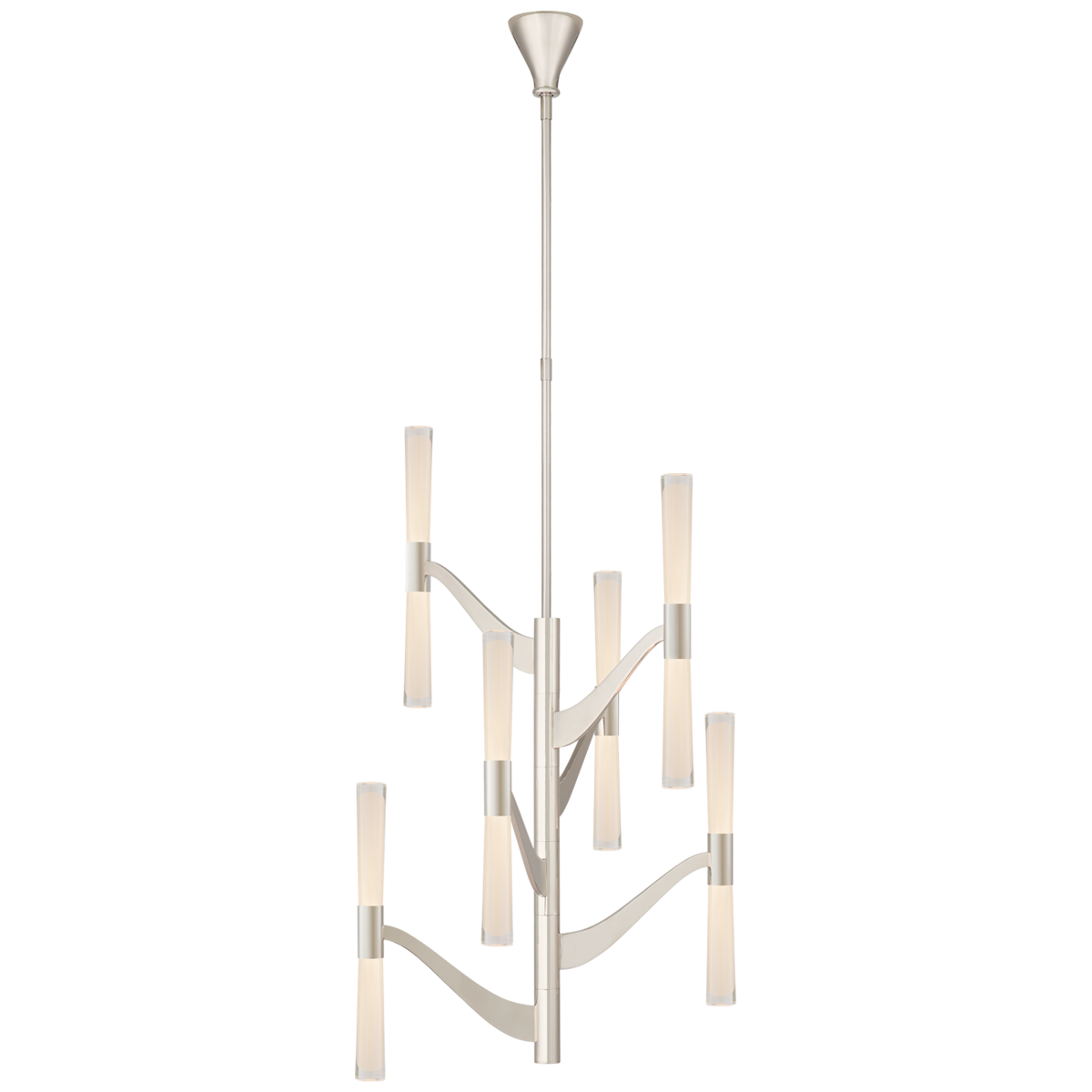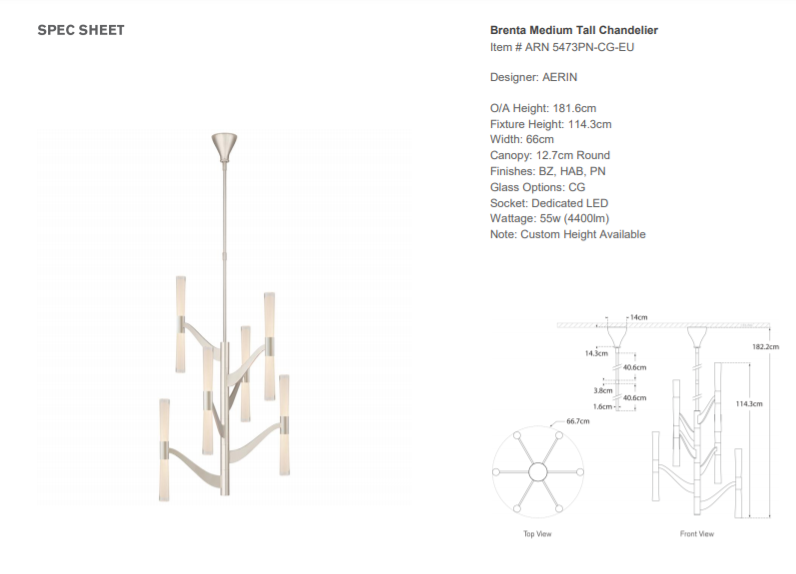 - Aerin's Brenta Medium chandelier is made of high-gloss polished nickel and finished with transparent glass. The lamp has an LED.