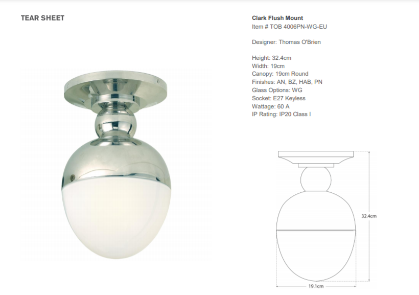 • The Clark plafond by Thomas O'Brien was made of polished nickel and finished with white glass. The lamp has a socket for an E 27 bulb.