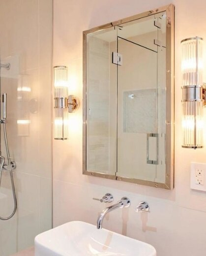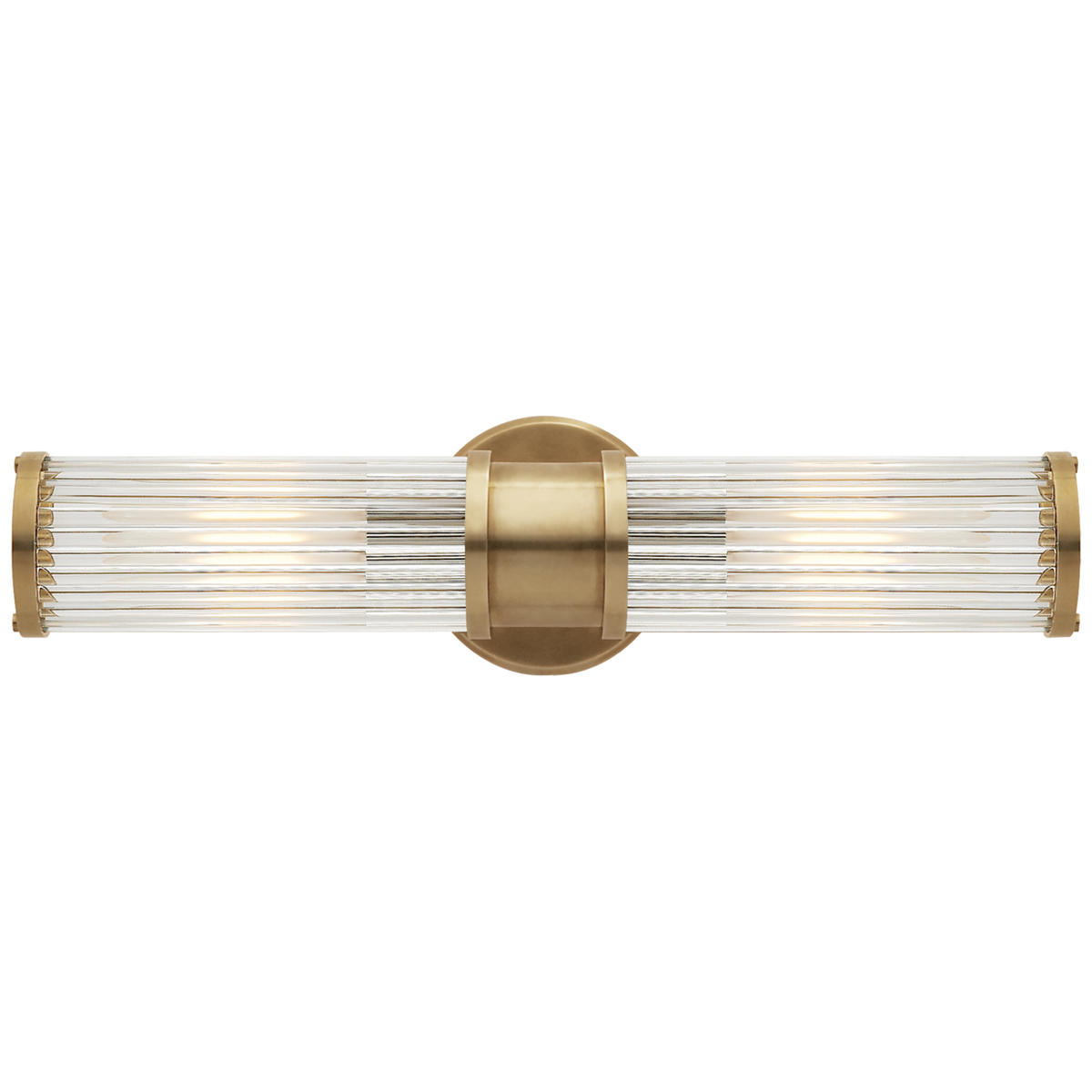 Kinkiet Allen Triple firmy Ralph Lauren Home został wykonany z mosiądzu oraz białego szkła. Lampa posiada gniazdo na żarówkę E 27. Wymiary: 44,4 x 11,4 x 12,7 cm.