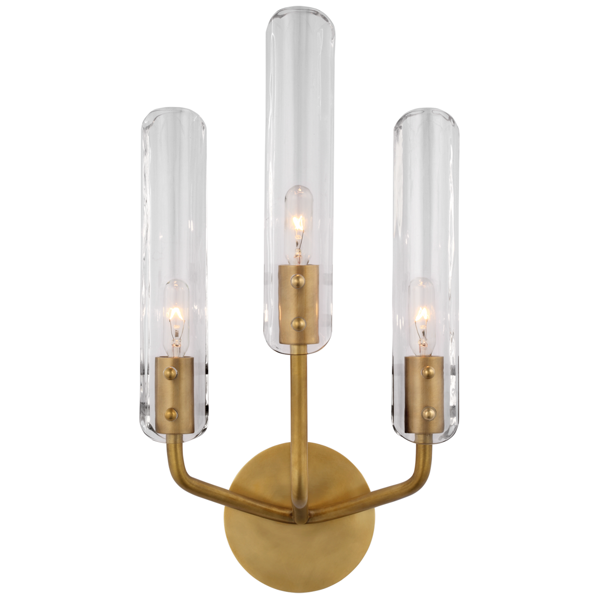 - Kinkiet Casoria 14" Triple projektu Aerin został wykonany z mosiądzu oraz wykończony przezroczystym szkłem. Lampa posiada gniazdo na żarówkę E 14.