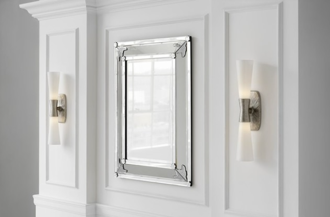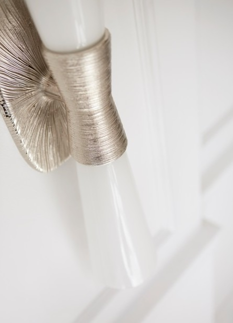 Kinkiet Utopia Small Double projektu Kelly Wearstler został wykonany z mosiądzu oraz wykończony białym szkłem. Lampa posiada gniazdo na żarówkę E 14.