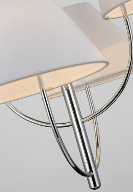 • Żyrandol Kinsley Large projektu Kate Spade New York został wykonany z polerowanego niklu oraz wykończony jasnymi, lnianymi abażurami. Żyrandol posiada gniazdo na żarówkę E 14.