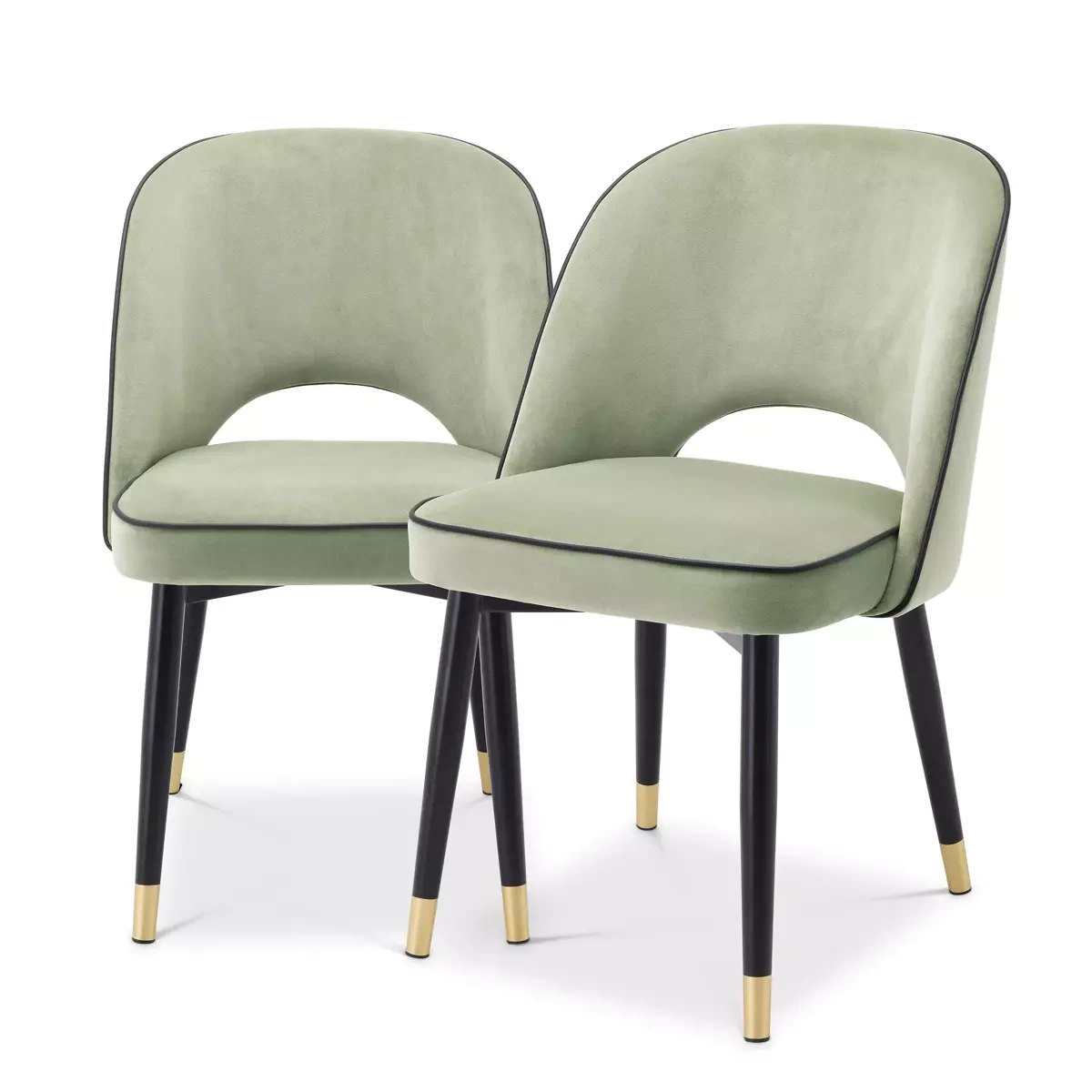 - Krzesło Cliff 2 firmy Eichholtz zostało wykonane z aksamitu w kolorze Savona pistache green oraz wykończone nogami w kolorze czarnym z mosiężnymi detalami. Zestaw zawiera dwa krzesła.
