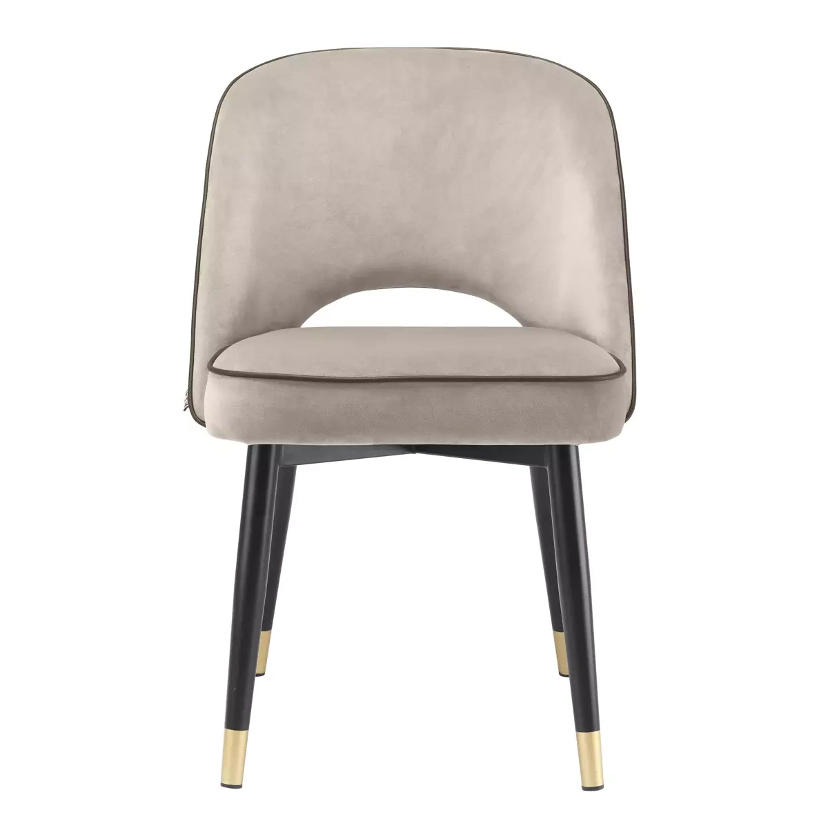 • Krzesło Cliff 2 firmy Eichholtz zostało wykonane z aksamitu w kolorze Savona greige oraz wykończone nogami w kolorze czarnym z mosiężnymi detalami. Zestaw zawiera dwa krzesła.
