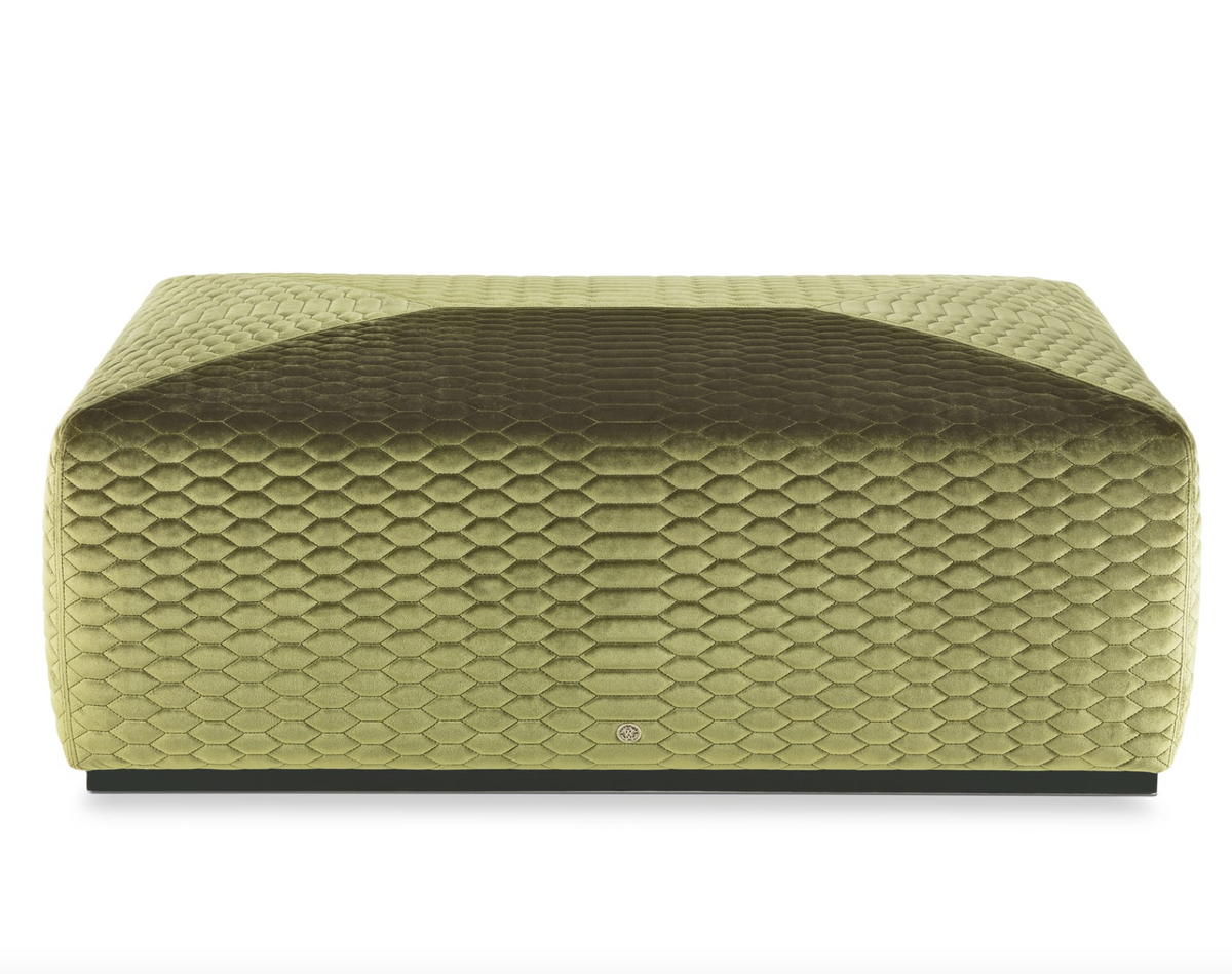 - Puf Hera firmy Roberto Cavalli Home Interiors o strukturze drewna topoli i pianki. Tapicerka z sześciokątnej pikowanej tkaniny Cat. A velvet Paul col. 403 Orange.