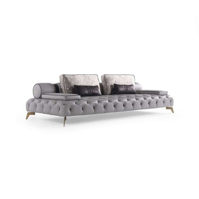 Sofa Darlington firmy Roberto Cavalli Home Interiors została wykonana z drewna topolowego i pianki. Tapicerka z materiału Fabric cat. A. Stopki z metalu dostępne we wszystkich wykończeniach z kolekcji. Wymiary: 240 x 120 x h 80 cm.