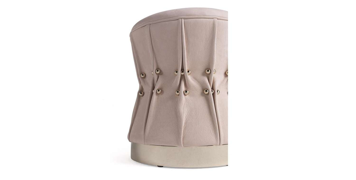 Puf Inanda firmy Roberto Cavalli Home Interiors. Struktura z drewna topoli i pianki. Metalowe detale dostępne we wszystkich wykończeniach z kolekcji. Drewniana podstawa lakierowana na złoto. Podana cena jest ceną za mebel w skórze. Wymiary: ø 38 x h 45 cm.