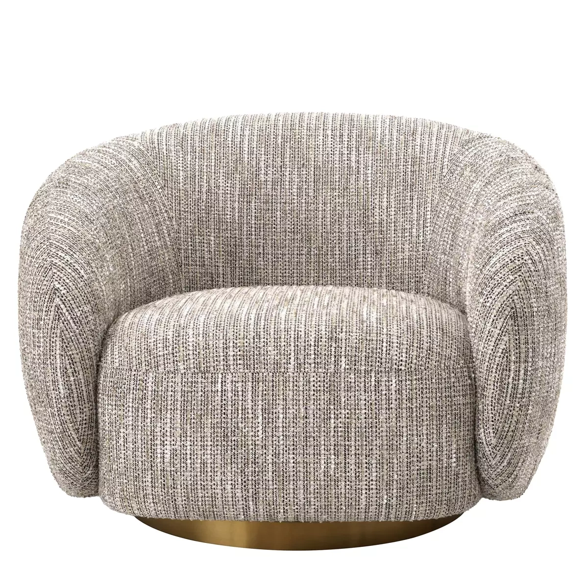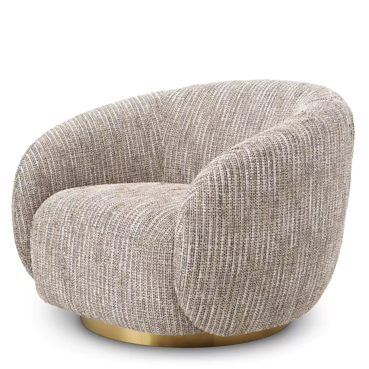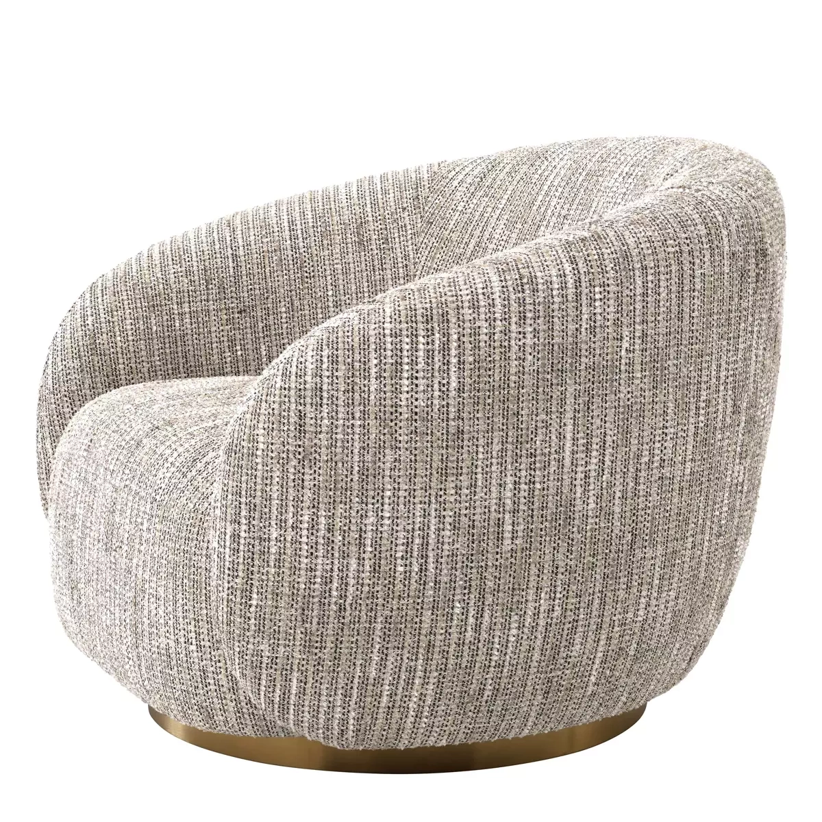 - Fotel Brice firmy Eichholtz został wykonany w tkaninie Mademoiselle beige oraz wykończony obrotową podstawą z mosiądzu.