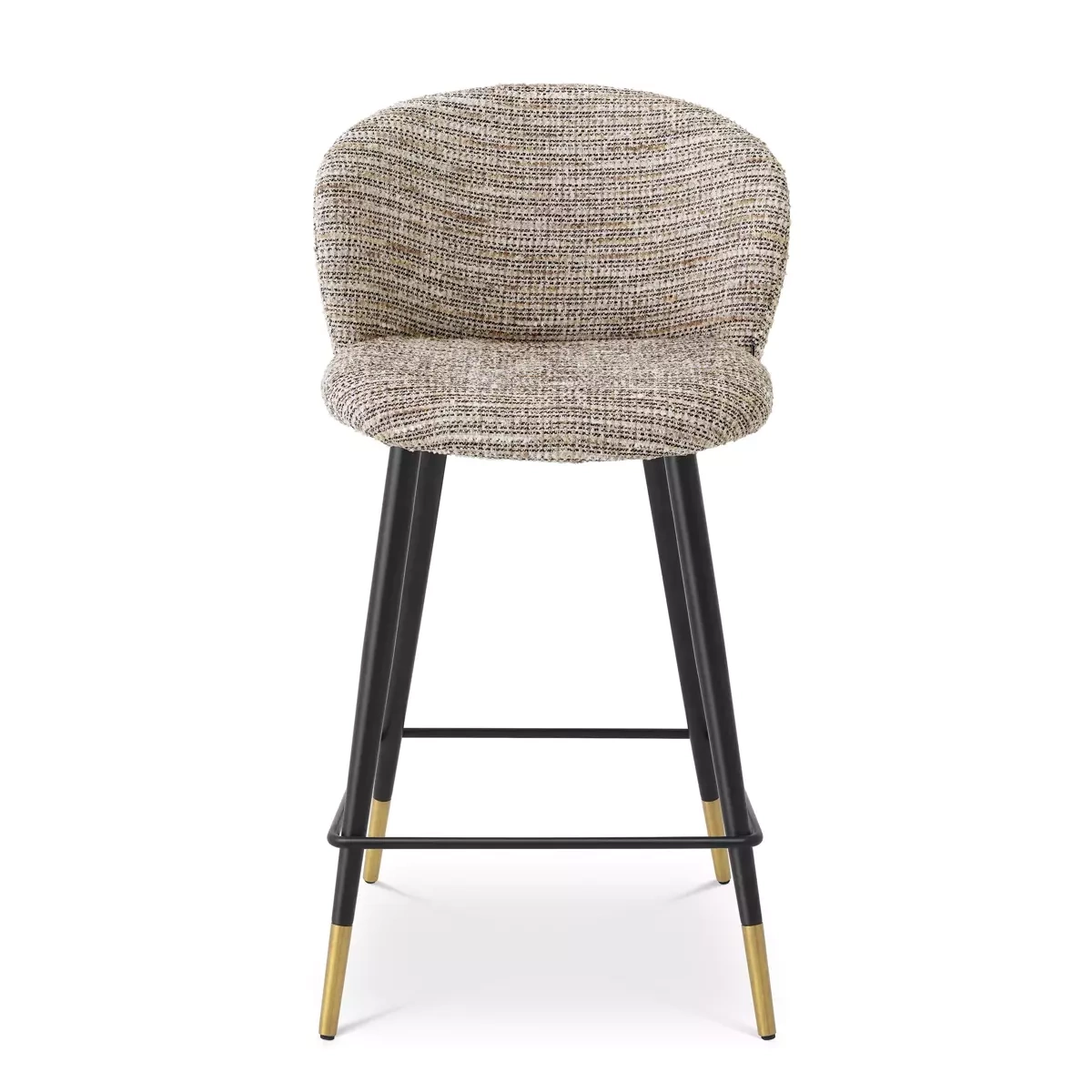 - Krzesło barowe Volante firmy Eichholtz zostało wykonane tkaniną Mademoiselle beige oraz wykończone nogami w czarno-złotym kolorze.