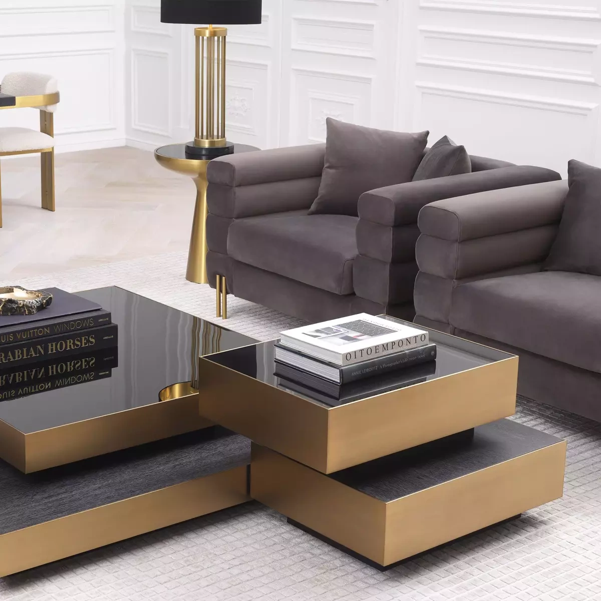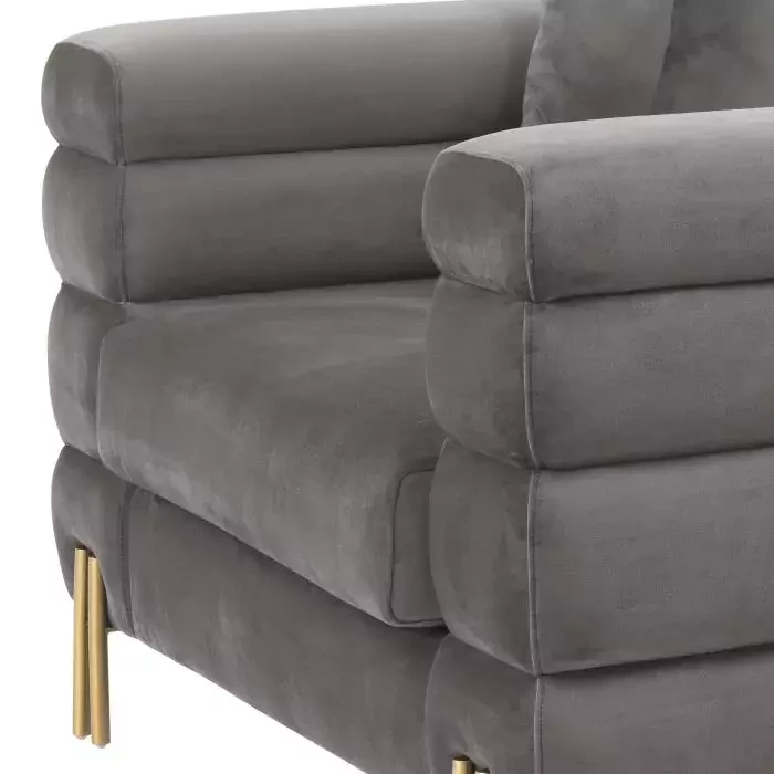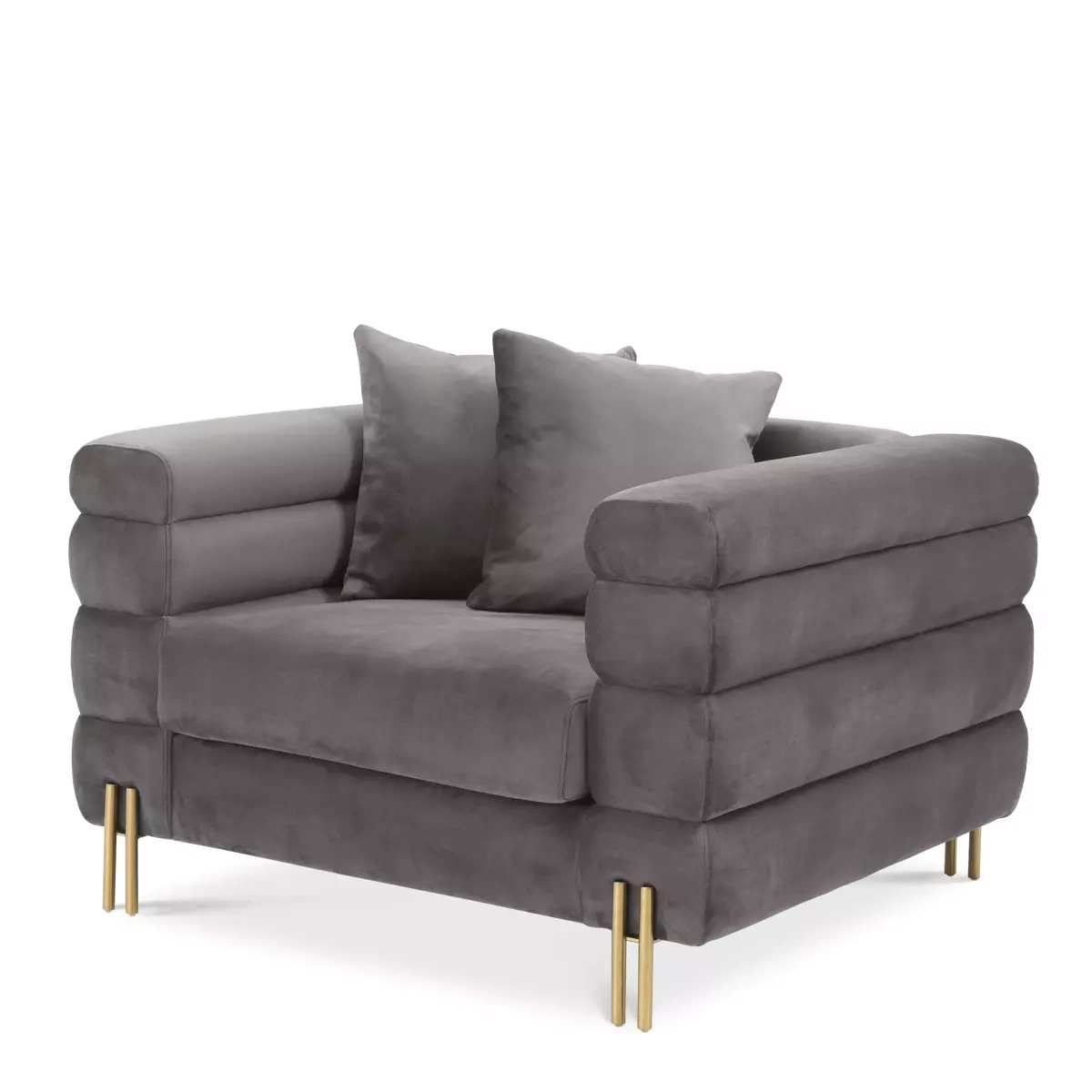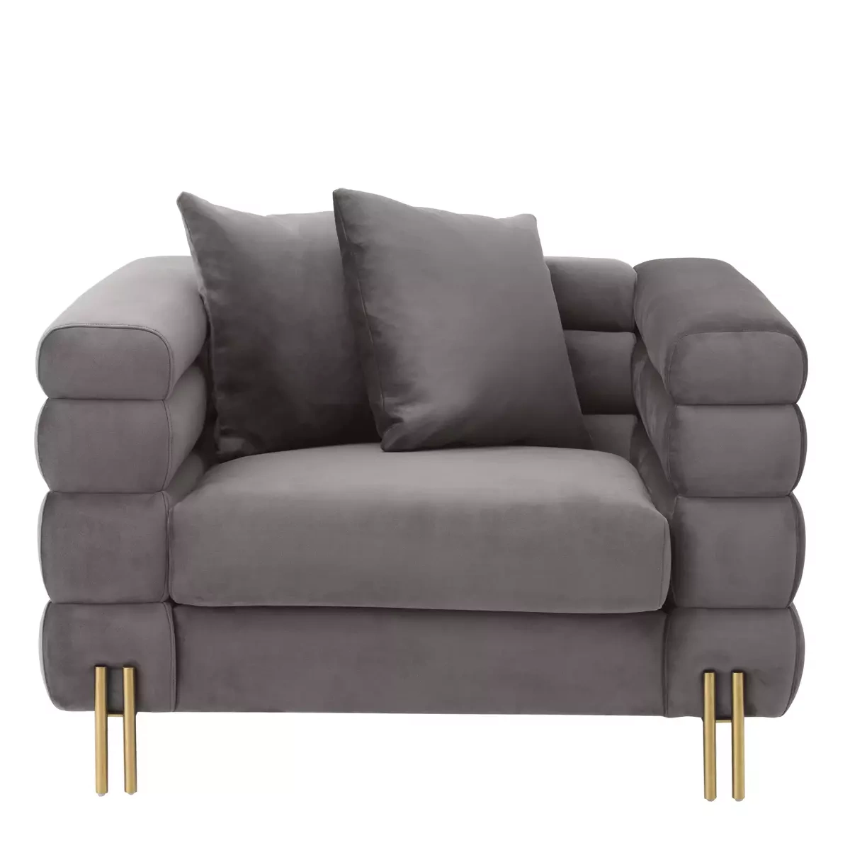 - Fotel York firmy Eichholtz został wykonany w kolorze Savona grey oraz wykończony mosiężnymi nogami.