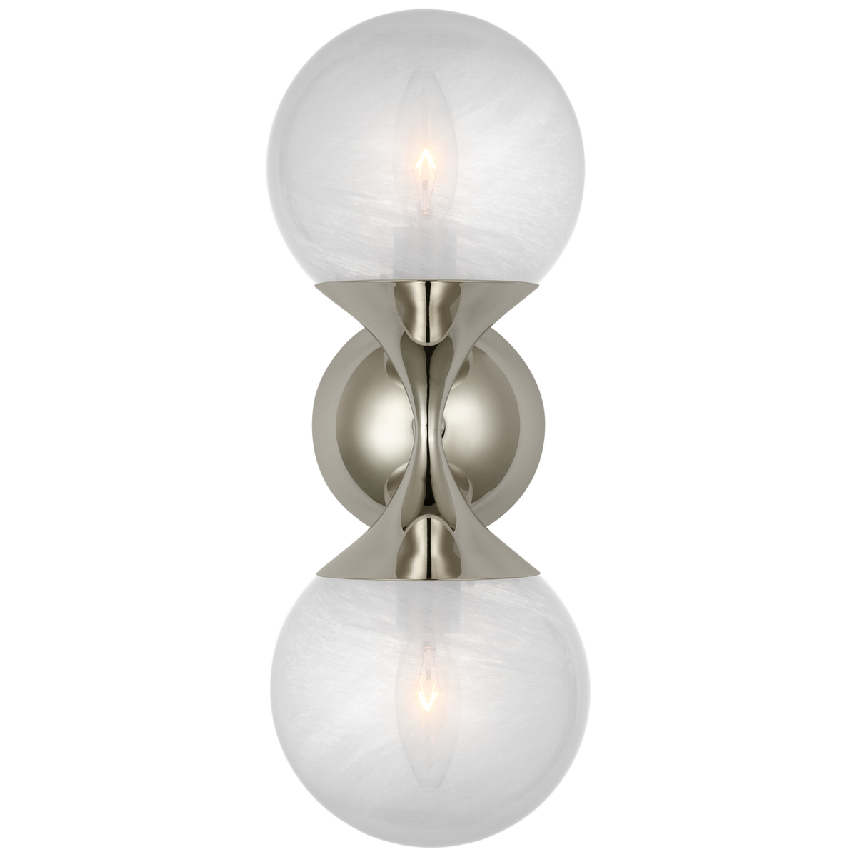 - Kinkiet Cristol Small Double projektu Aerin został wykonany z polerowanego niklu oraz wykończony białym szkłem. Lampa posiada gniazdo na żarówkę E 14.