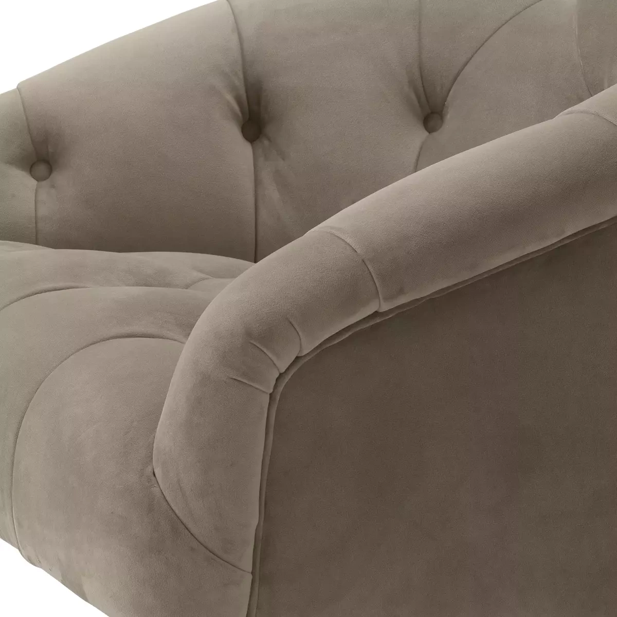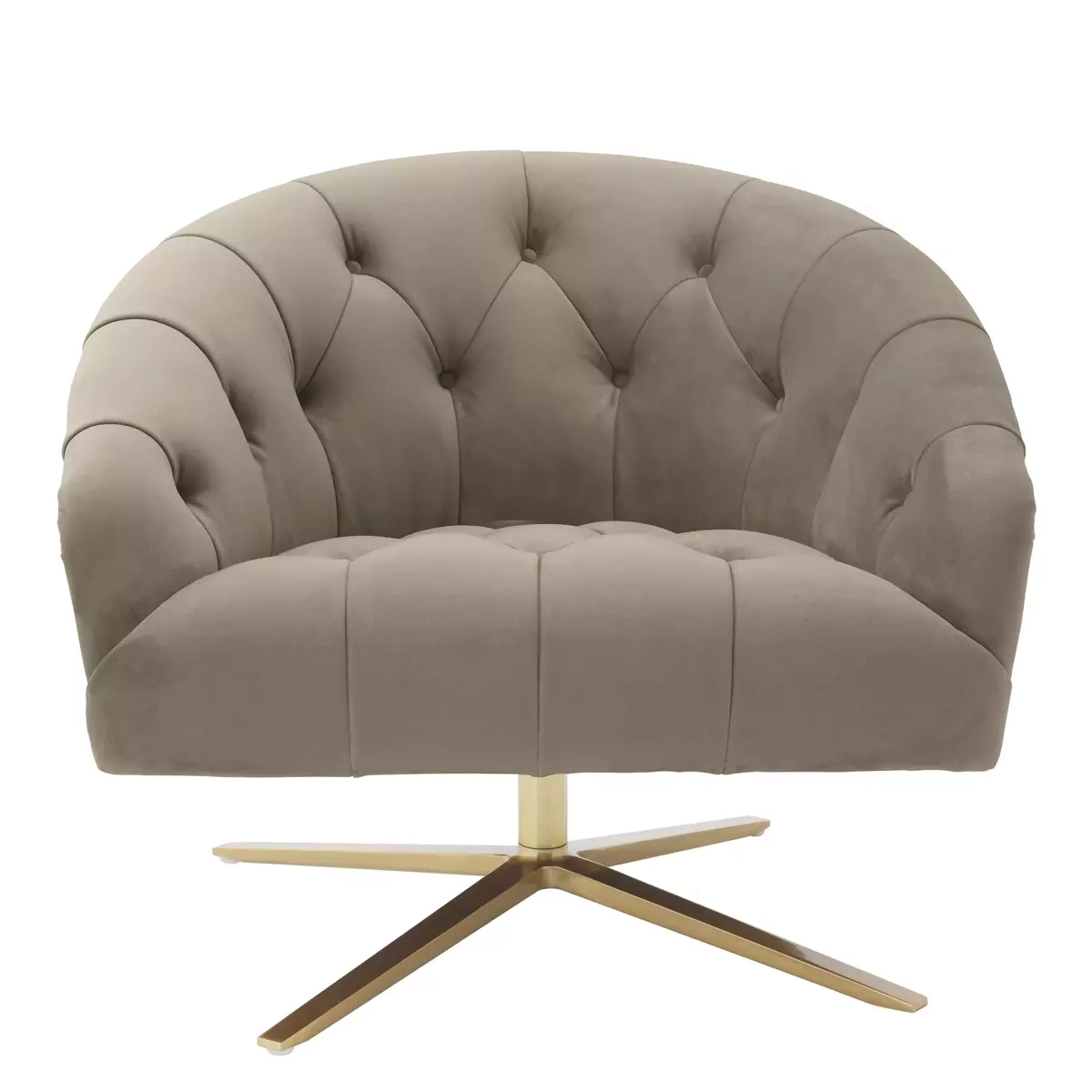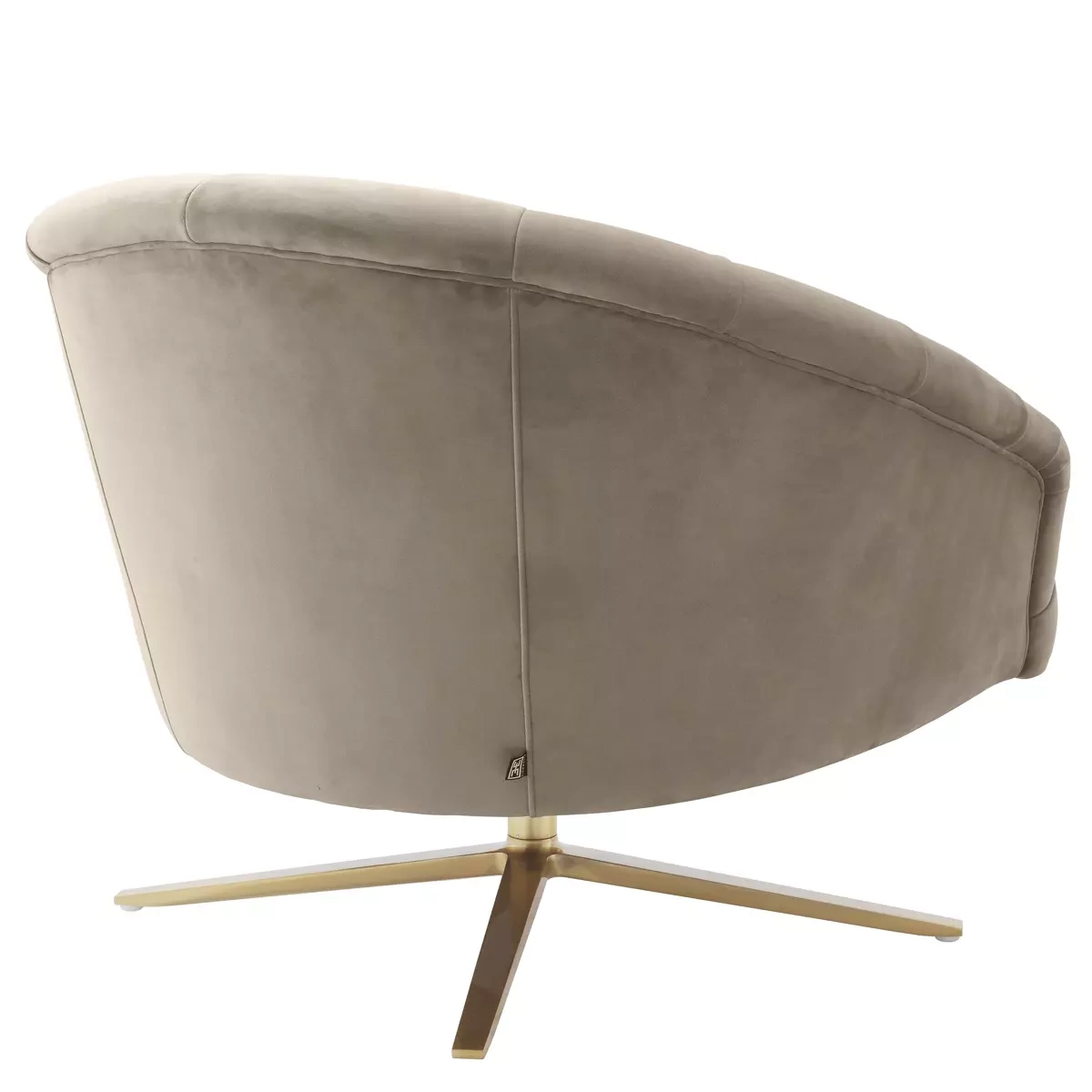 - Fotel obrotowy Gardner firmy Eichholtz został wykonany z aksamitu Savona greige oraz wykończony podstawą ze szczotkowanego mosiądzu.