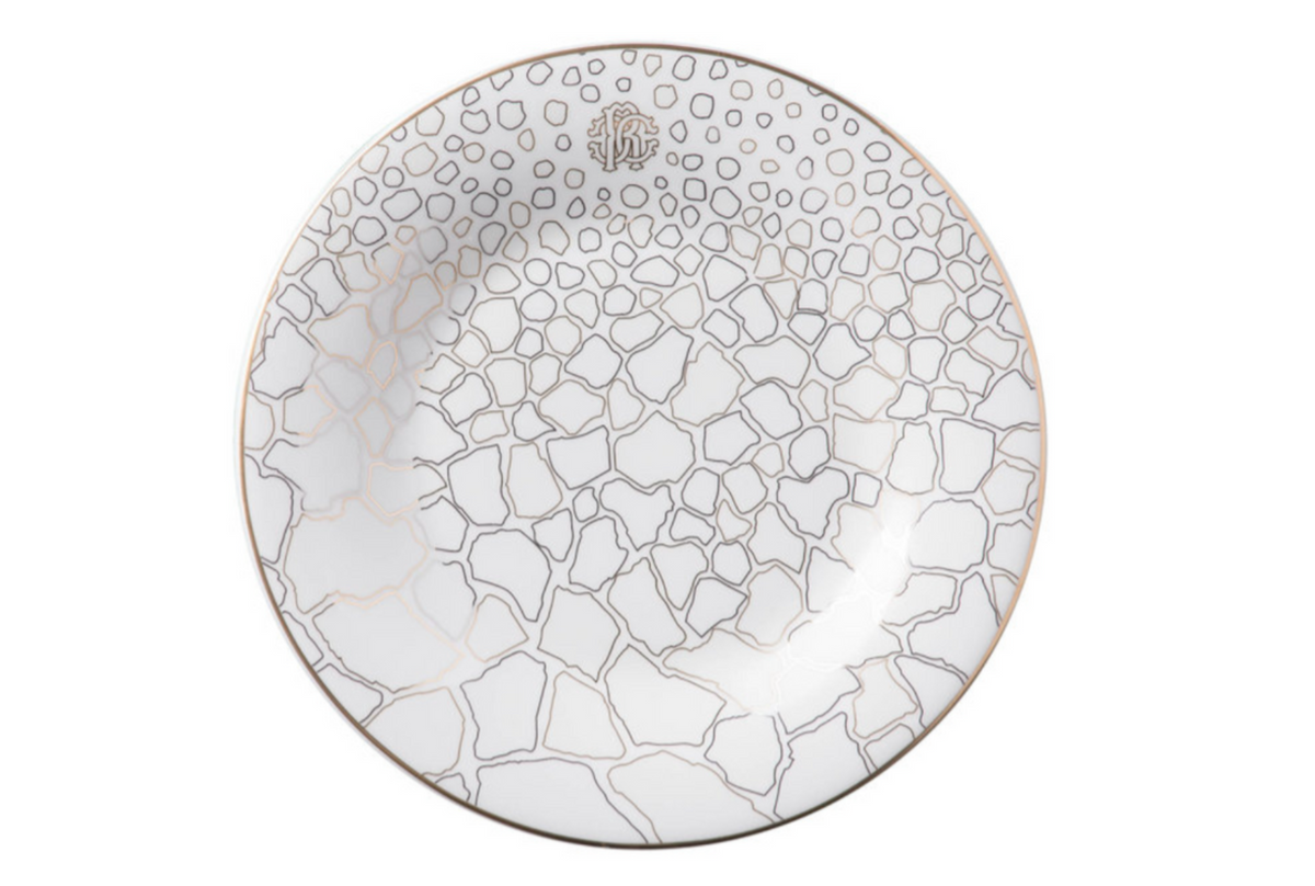 - Talerz deserowy został wykonany z wysokiej jakości porcelany kostnej. Odznacza się wewnętrzną powłoką, pokrytą złotem i platyną, przypominającą skórę żyrafy oraz monogramem wytłoczonym wewnątrz Roberto Cavalli.