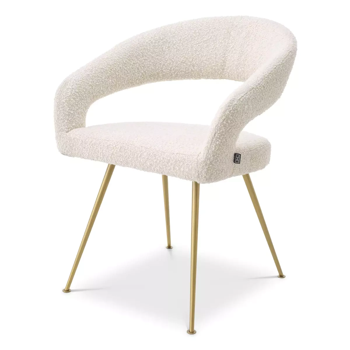 - Krzesło Bravo firmy Eichholtz zostało wykonane tkaniną w kolorze Bouclé Cream oraz wykończone nogami ze szczotkowanego mosiądzu.