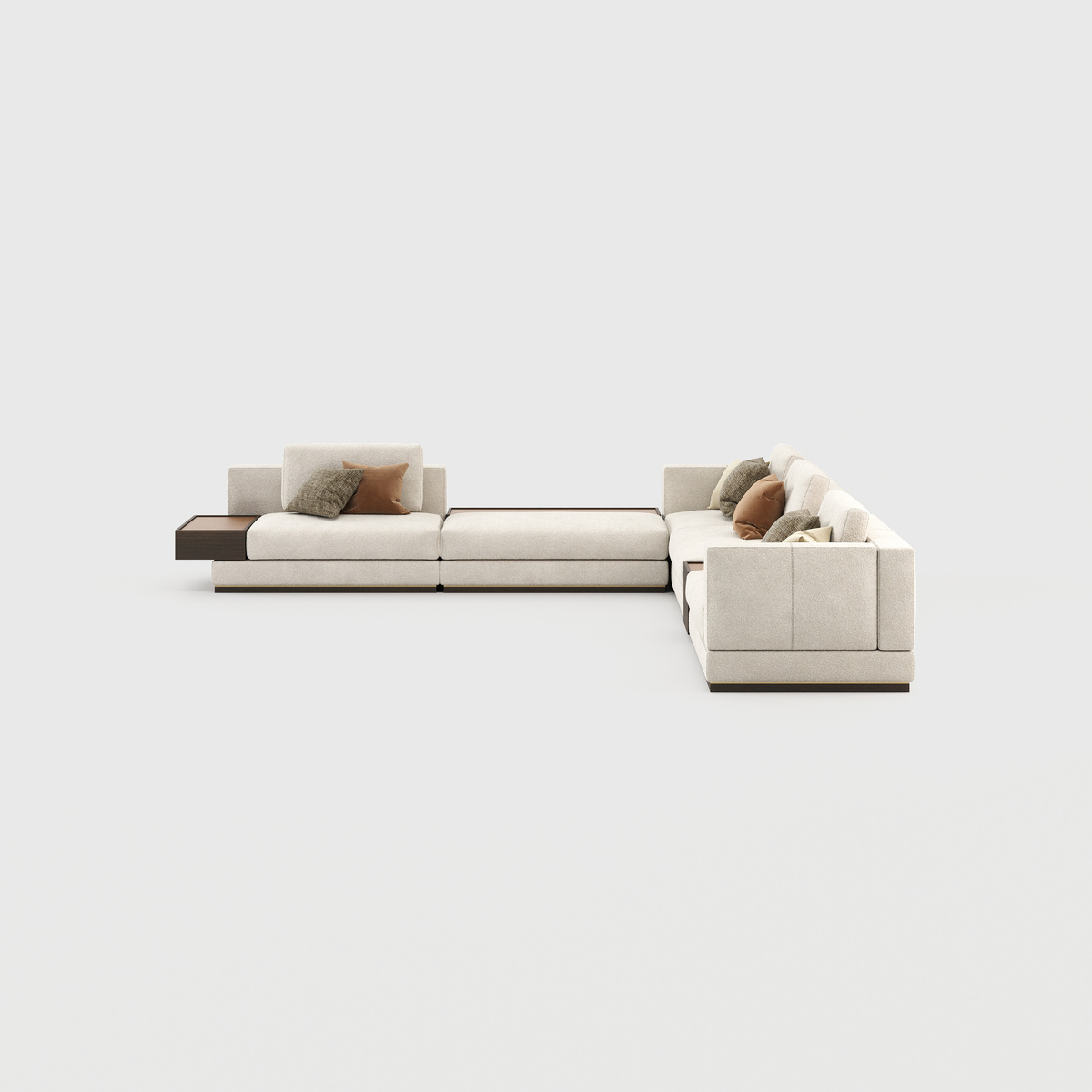 Sofa Fletcher firmy Laskasas została wykonana z dębu, pozłacanej, szczotkowanej stali nierdzewnej oraz wykończona wiedeńska tkaniną Helsinki Pearl. Produkt dostępny na zamówienie również ze skóry. Wymiary: 480 x 393 x 93,1 cm.