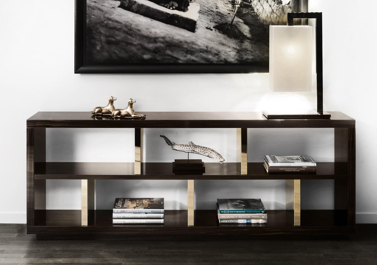 - Komoda Sloane firmy Dom Edizioni została wykonana lakierem matowym oraz wykończony błyszczącym mosiądzem.