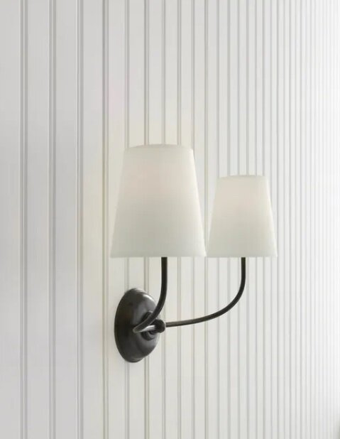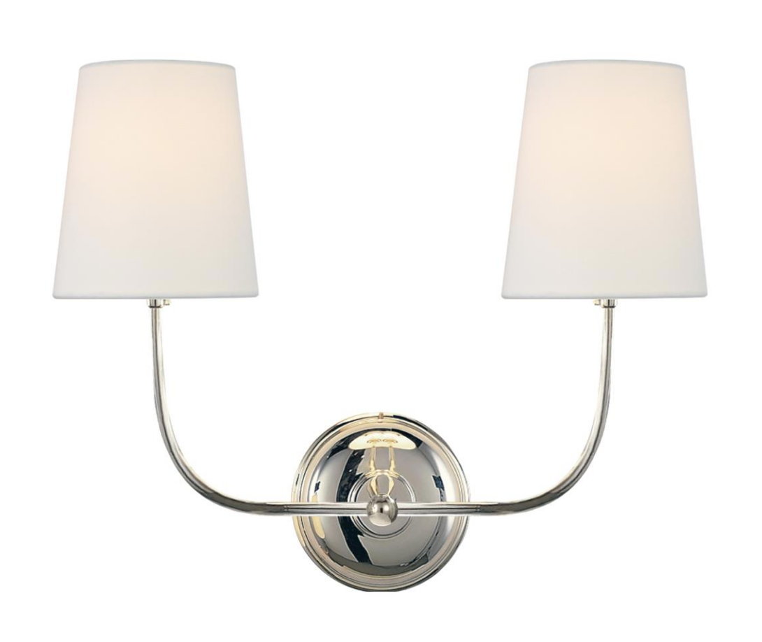 - Kinkiet dwuramienny Vendome projektu Thomas O'Brien marki Visual Comfort w polerowanym niklu, z lnianymi abażurami.