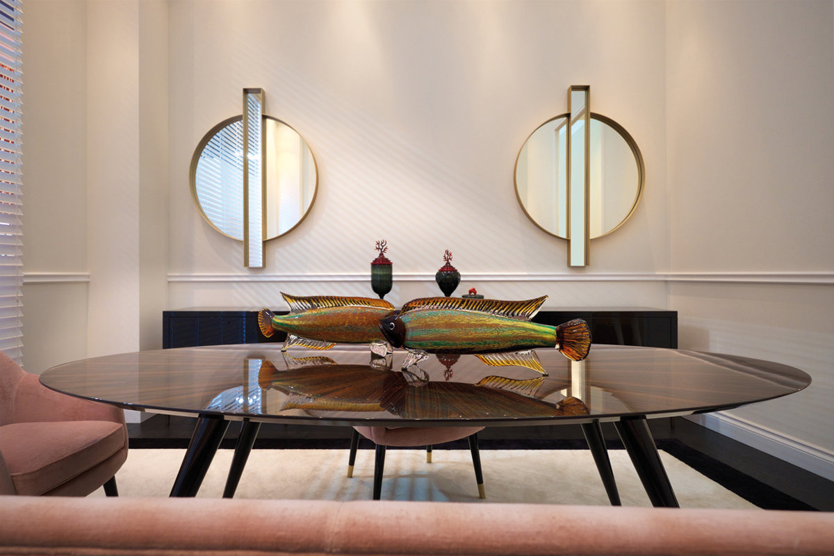Lustro Max firmy Dom Edizioni posiada konstrukcje metalowa dostępną z mosiądzu satynowego lub mosiądzu polerowanego. Wymiary: 100 x 140 cm.