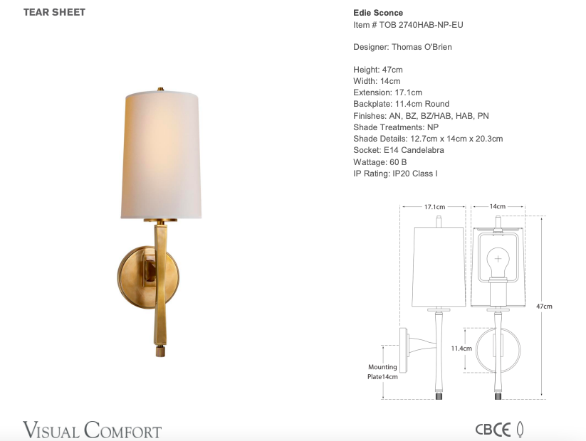 - Kinkiet Edie projektu Thomas O'Brien został wykonany z antycznego mosiądzu ręcznie przetartego oraz wykończony jasnym, lnianym abażurem. Lampa posiada gniazdo na żarówkę E14
