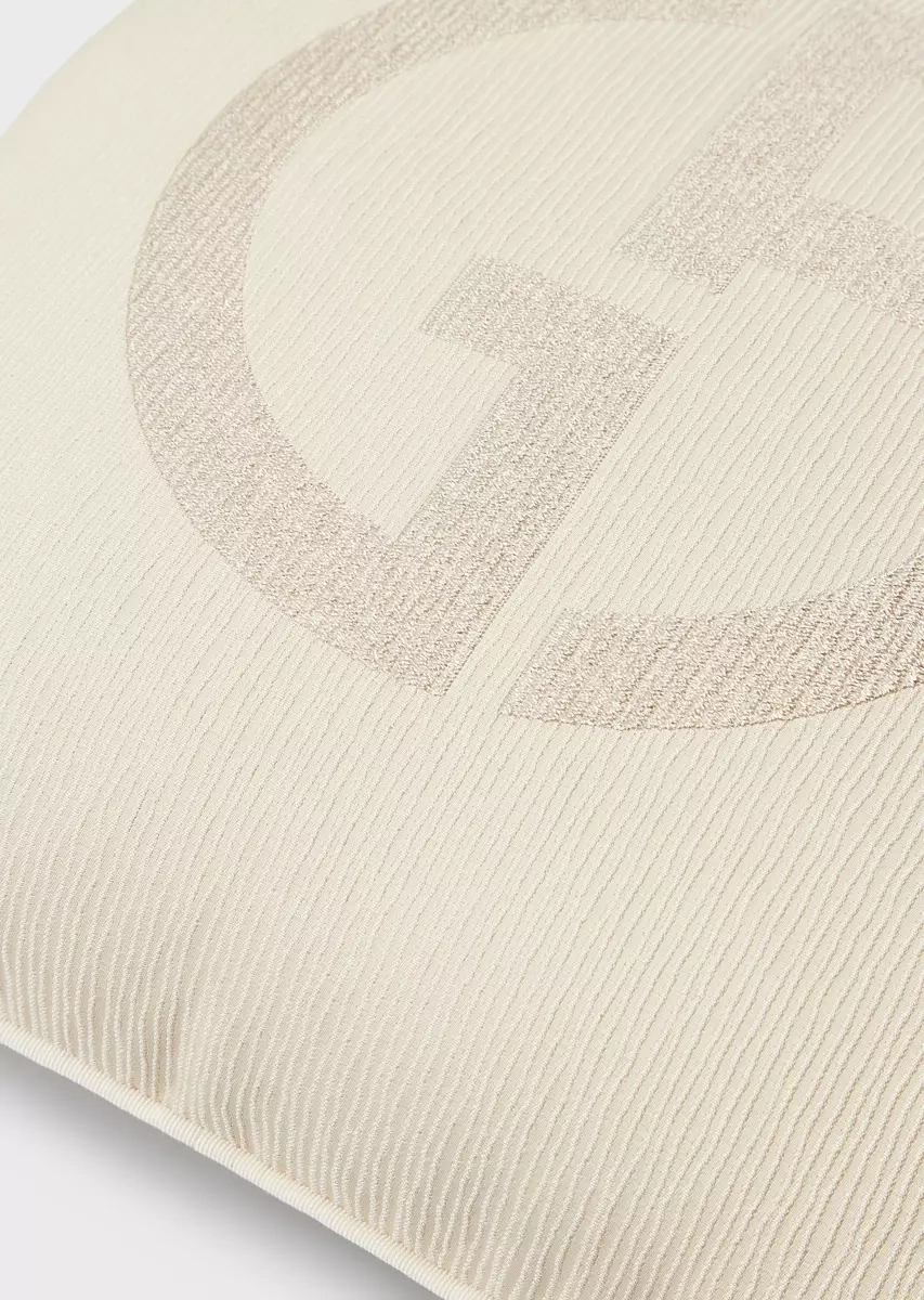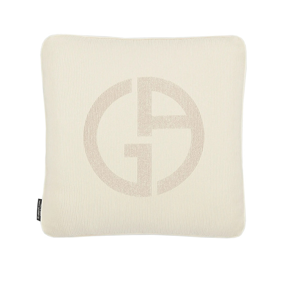 Poduszka dekoracyjna Janette firmy Armani Casa została wykonana z wiskozy 44%, bawełny 20%, poliestru 8%, jedwabiu 4% oraz wykończona w kolorze kości słoniowej z logiem na przodzie i gładkim tyłem. Wymiary: 40 x 40 cm.