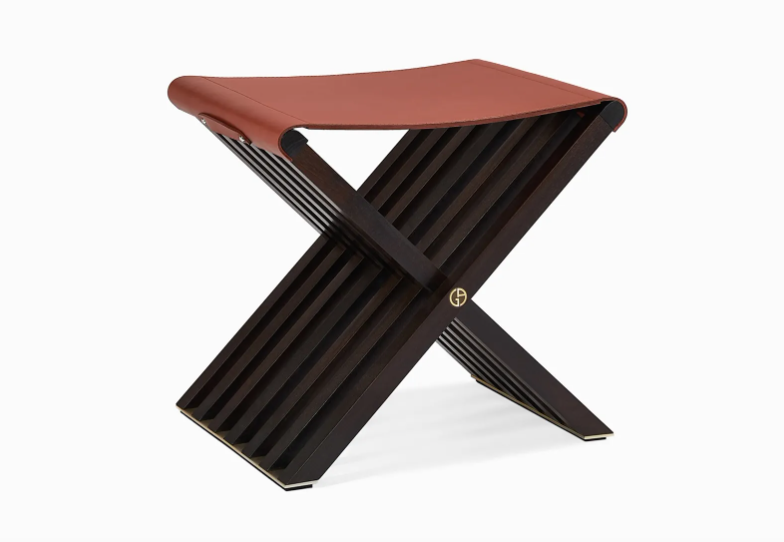 Armani CasaPuf składany Roxy marki Armani Casa wykonany z litego orzecha włoskiego, z siedziskiem z grubej skóry (cuoio). Nogi w kształcie litery X poruszają się wokół osi wzbogaconej metalowym logo GA. Patrząc z boku, nogi ukazują strukturę wykonaną z kilku drewnianych listew. Roxy posiada małe skórzane uchwyty po bokach, aby ułatwić transport. Dostępne w różnych kolorach skóry (cuoio). Wymiary: 48 x 48 x 42 cm.