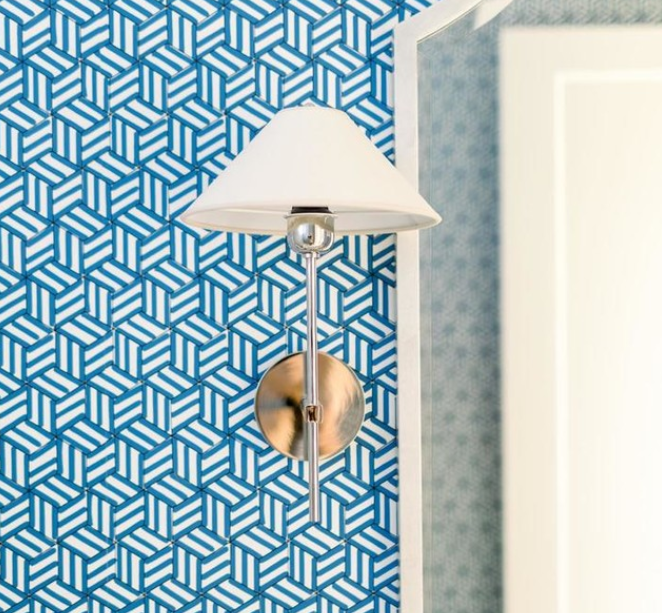 - Kinkiet Hackney projektu J. Randall Powers z polerowanego niklu wykończony lnianym abażurem. Lampa posiada gniazdo na żarówkę E 14.