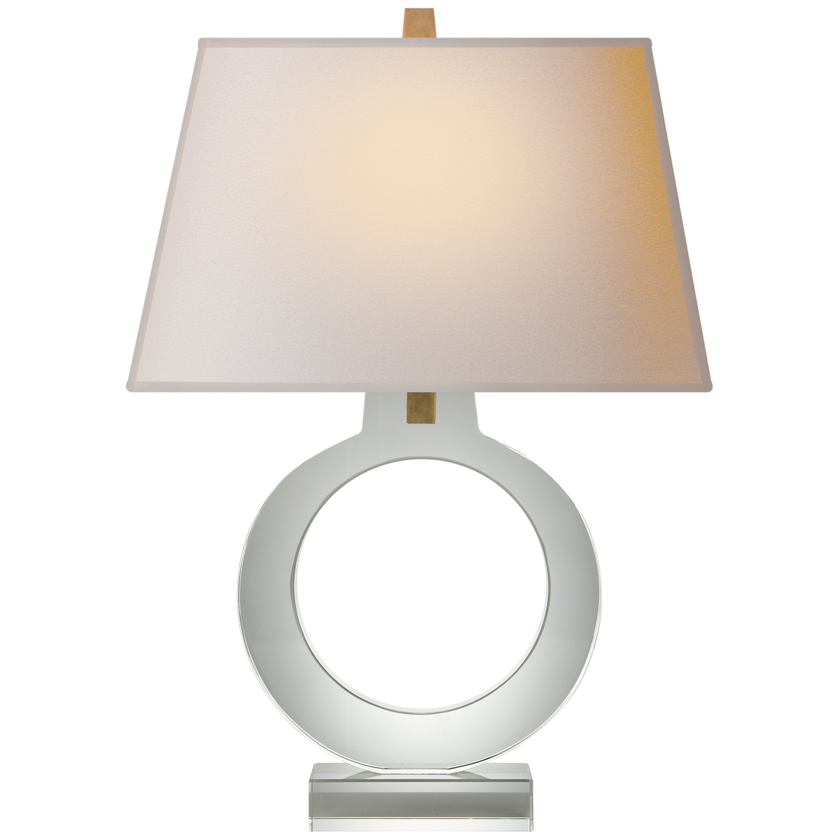 - Lampa stołowa Ring projektu Chapman & Myers została wykonana z kryształu oraz wykończona jasnym abażurem. Lampa posiada gniazdo na żarówkę E 27.