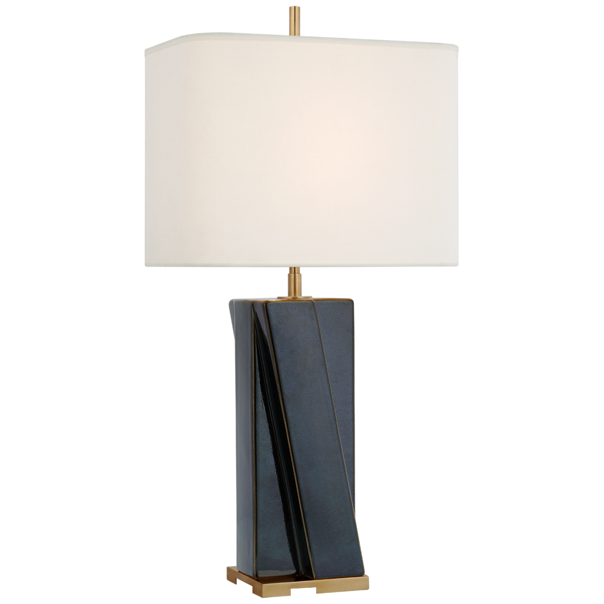 Lampa stołowa Niki firmy Thomas O'Brien wykonana w niebiesko-brązowym odcieniu oraz wykończona jasnym, lnianym abażurem. Lampa posiada gniazdo na żarówkę E 27. Wymiary: 69,8 x 41,9 x 17,8 cm