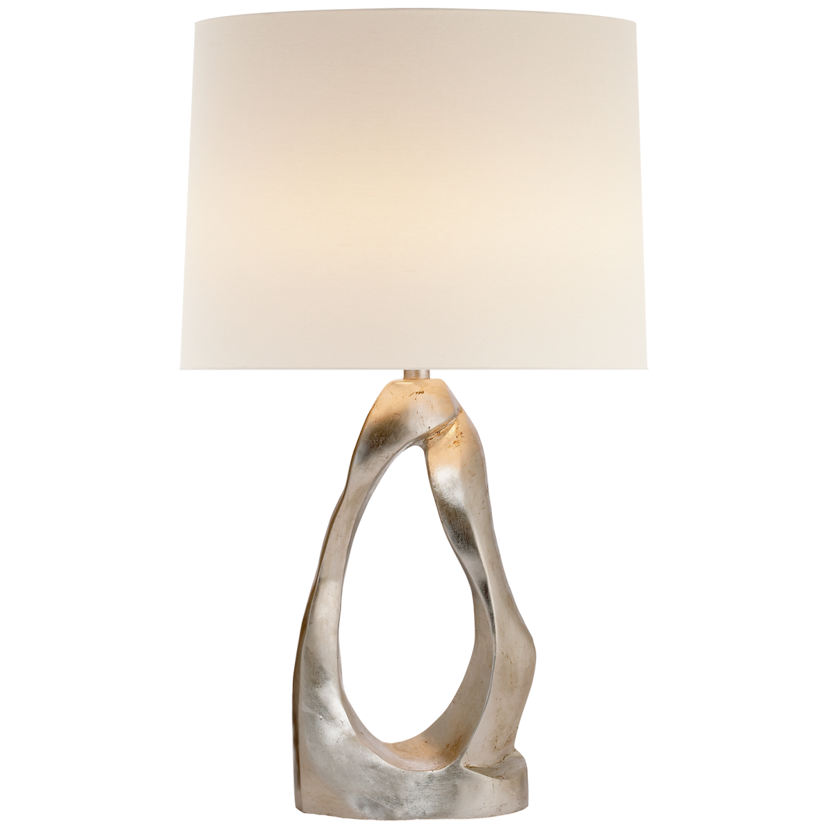 - Lampa stołowa Cannes projektu Aerin w kolorze oksydowanego srebra, wykończona jasnym, lnianym abażurem. Lampa posiada gniazdo na żarówkę E 27.