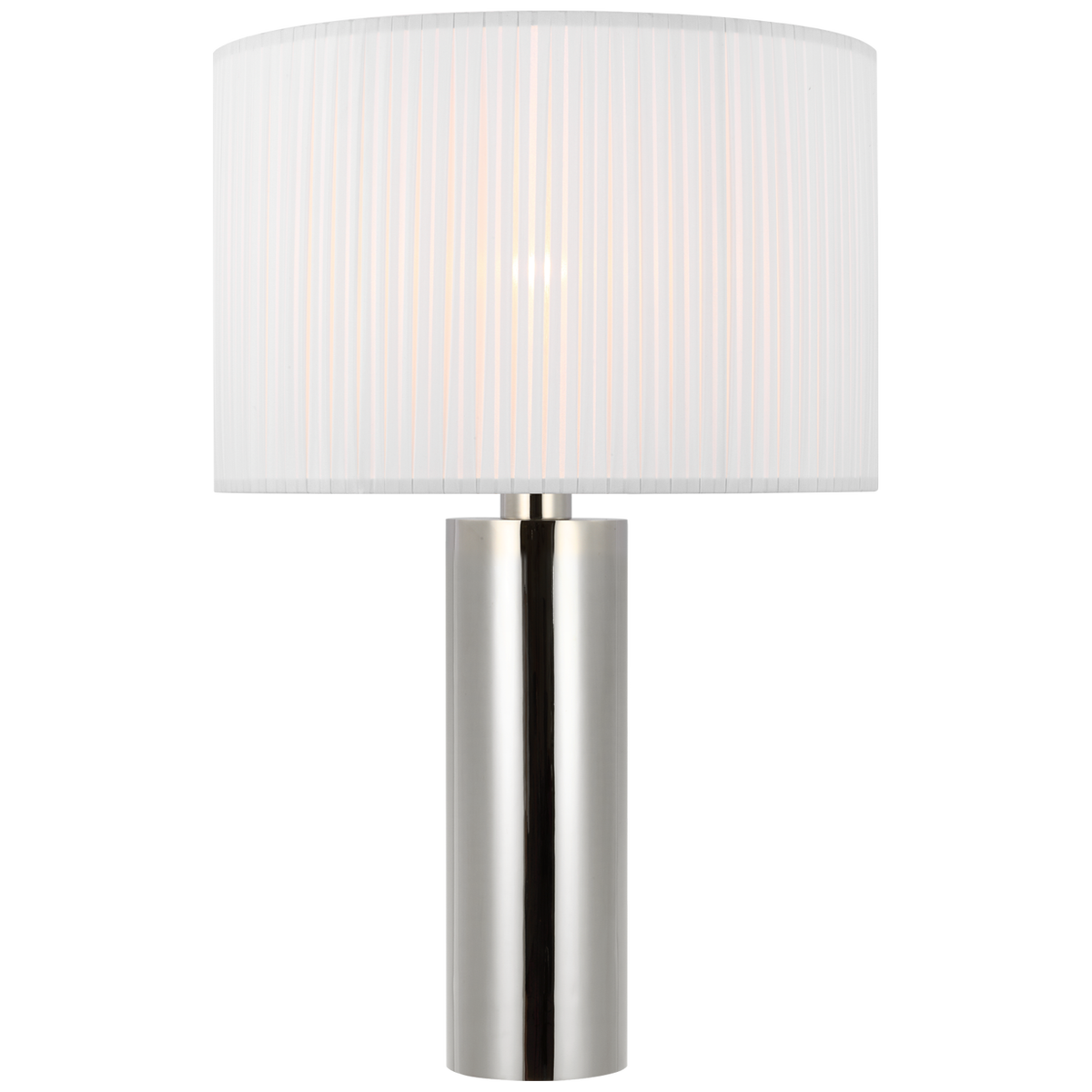 Lampa stołowa Costes Medium projektu Paloma Contreras marki Visual Comfort została wykonana z polerowanego niklu oraz wykończona lnianym, jasnym abażurem. Lampa posiada gniazdo na żarówkę E 27. Wymiary: 66,7 x 39,4 x 11,4 cm.